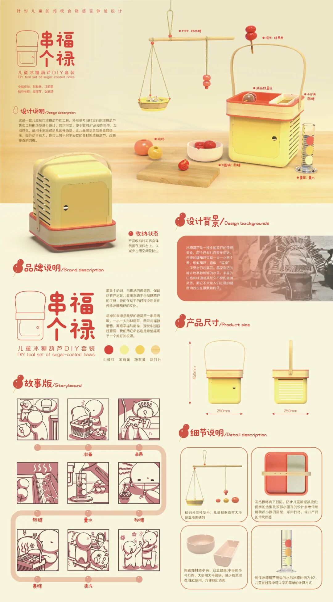 作品简介:这是一套为儿童设计的冰糖葫芦制作工具。外形参考传统的北京冰糖葫芦售卖工具造型进行设计,简约可爱、便于收纳;产品操作简单,互动性强,适用于家庭和幼儿园等场景,让儿童感受传统美食的魅力,提升动手能力,也可以将平时不爱吃的食材制成糖葫芦,改善挑食的习惯。