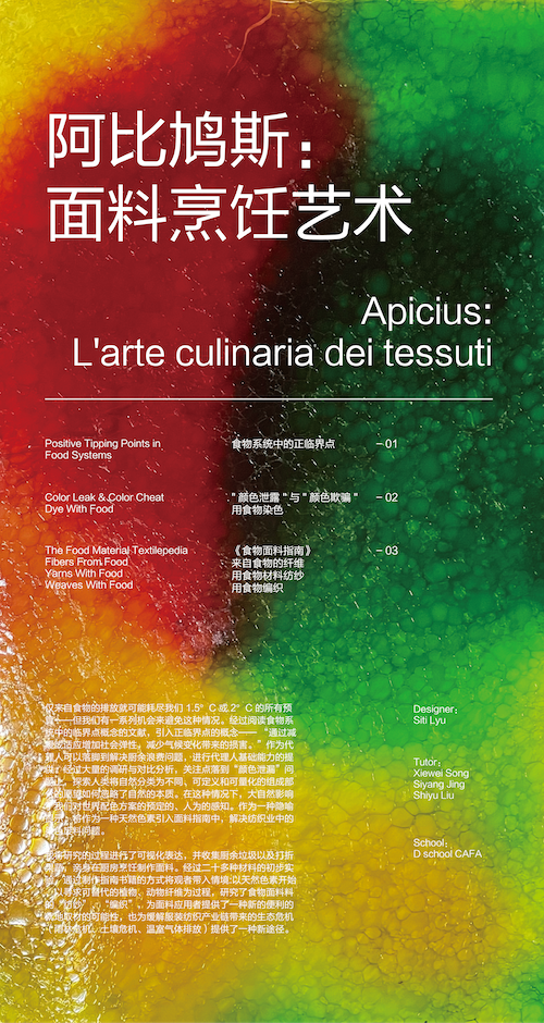作品简介:仅来自食物的排放就可能耗尽我们 1.5°C 或 2°C 的所有预算——但我们有一系列机会来避免这种情况。经过阅读食物系统中的临界点概念的文献,引入正临界点的概念—— “通过减缓或适应增加社会弹性,减少气候变化带来的损害。”作为代理人可以落脚到解决厨余浪费问题,进行代理人基础能力的提供。经过大量的调研与对比分析,关注点落到“颜色泄漏”问题上,探索人类将自然分类为不同、可定义和可量化的组成部分的愿望如何忽略了自然的本质。在这种情况下,大自然影响了我们对世界配色方案的预定的、人为的感知。作为一种隐喻提示,将作为一种天然色素引入面料指南中,解决纺织业中的染色废料问题。