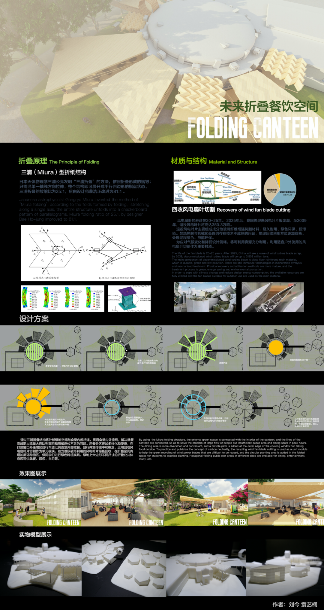 作品简介:基于国内高校食堂的普遍问题(如座位排布,流线不佳,缺乏空间层次等),以清华校园内丁香园食堂为例,结合周边绿地,进行系统的折叠餐饮空间设计。过三浦折叠结构将外部绿地空间与食堂内部相连,贯通食堂内外流线,解决就餐高峰期人流量大而队列面积和用餐座位不足的问题。用餐分区更加多样化和便捷,在打菜窗口外缘增加自行车道以供食堂外部取餐。践行并宣传碳中和概念,运用回收风电扇叶片切割作为单元模块,助力难以被再利用的风电叶片绿色回收,在折叠空间内增加循环种植区,供同学们进行绿色种植实践。绿地上六边形不同尺寸的折叠公共休息区可供就餐、娱乐、自习等。