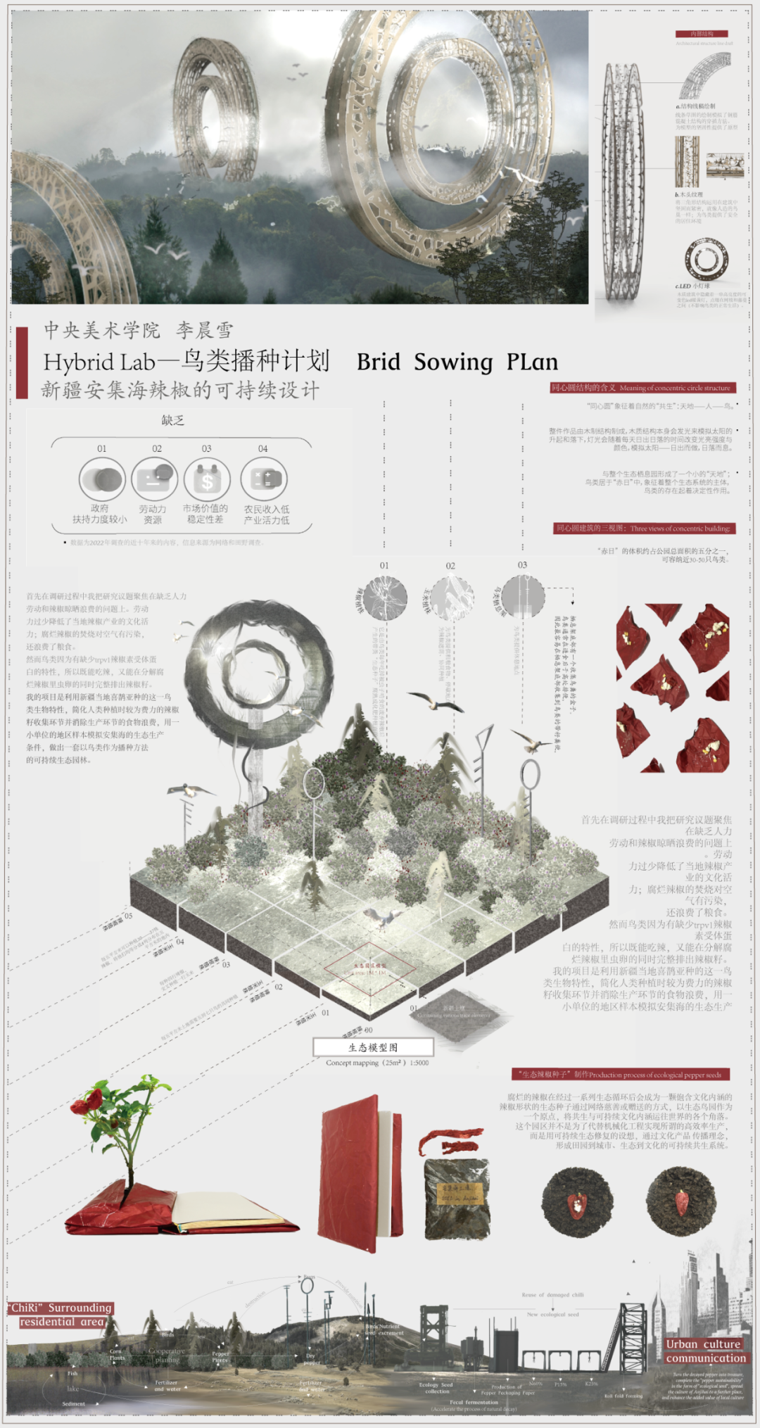 作品简介:Hybrid Lab——鸟类播种计划,译为“混生实验室”,这个项目是基于新疆安集海辣椒所面临的人力种植问题进行的在地性生态解决方案,旨在解决新疆人力劳动问题的同时,形成一个生态鸟类保护园区,尝试去构建由鸟类引导的不同生态系统之间的共生关系。