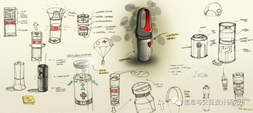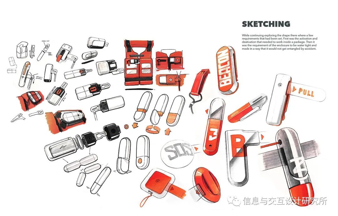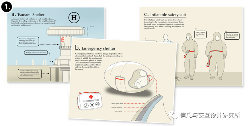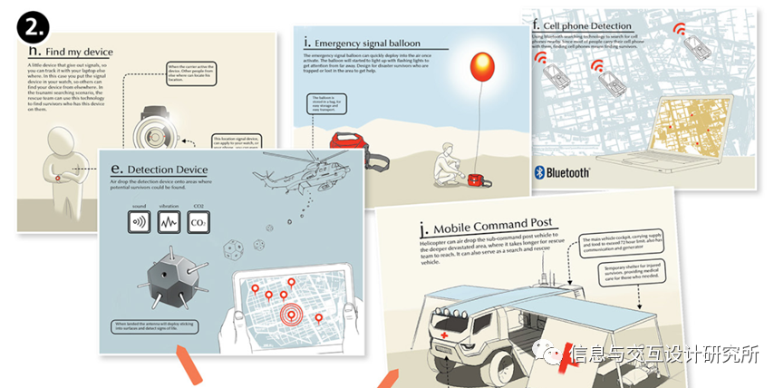 设计者在调研后进行了三个概念的整理:1.a)海啸避难。b)紧凑的应急避难。c)个人充气安全服。2.从小型跟踪设备到全尺寸移动指挥卡车。3.各种不同功能的设备来支持新的碎片模式。