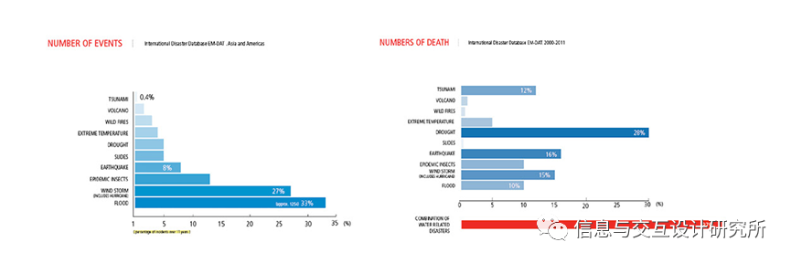 设计者研究了不同的自然灾害,并将每种灾害与其他灾害的比例进行了比较。以及每一场灾难造成的死亡人数。