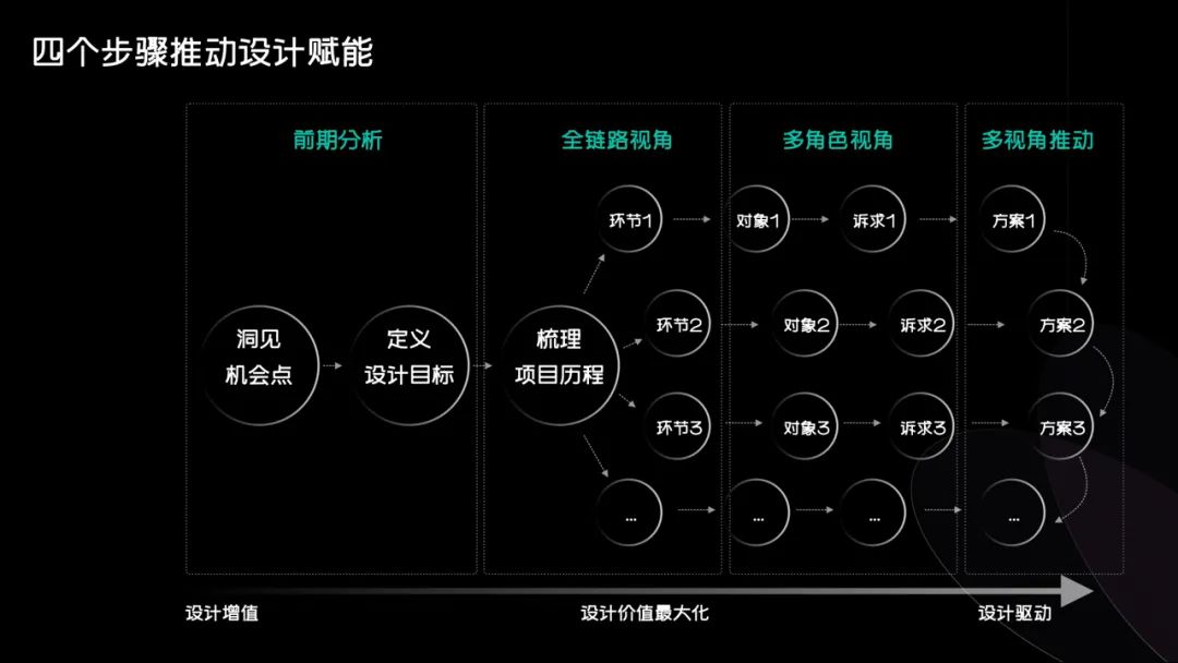 整体来说,以服务设计视角推动设计赋能的方法其实就是从设计增值逐步过渡到设计驱动的体现,通过前期以设计师专业能力洞见及分析,探索创新机会点,实现设计增值,逐步过渡到通过全链路多角色视角,来不断推动设计驱动业务,以最大的程度发挥设计的价值。