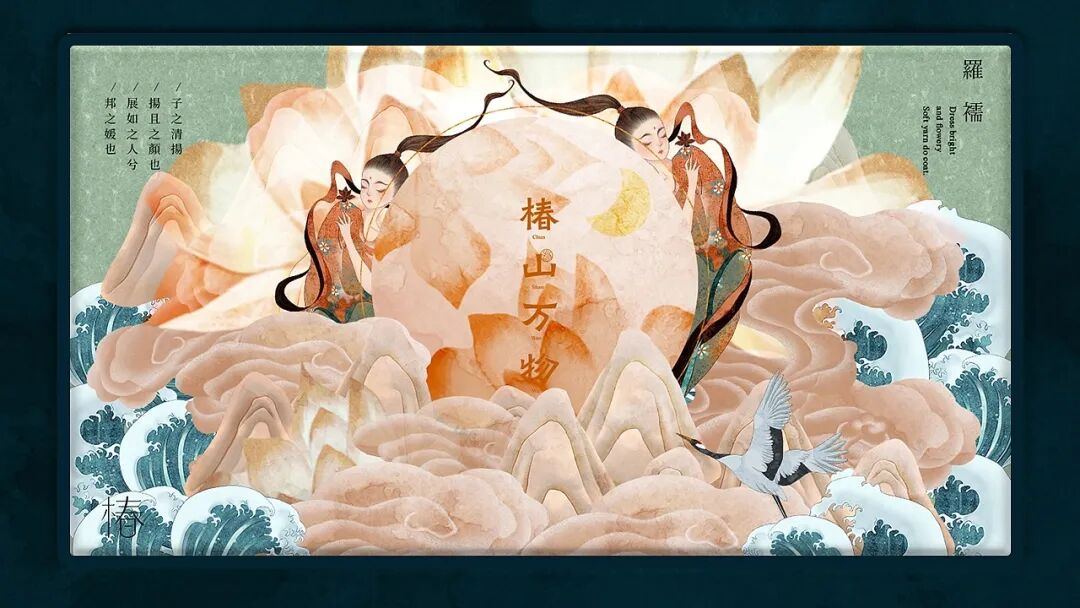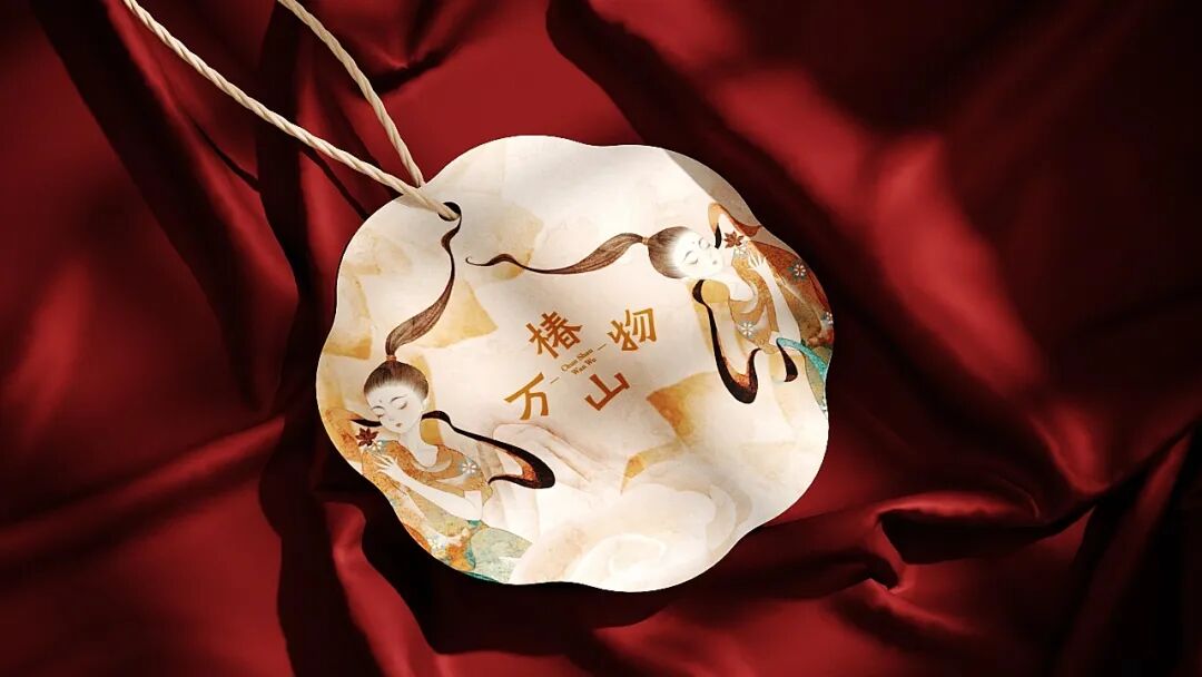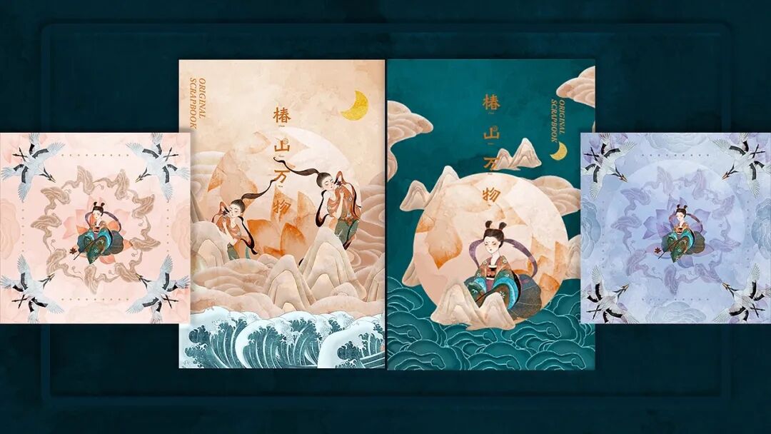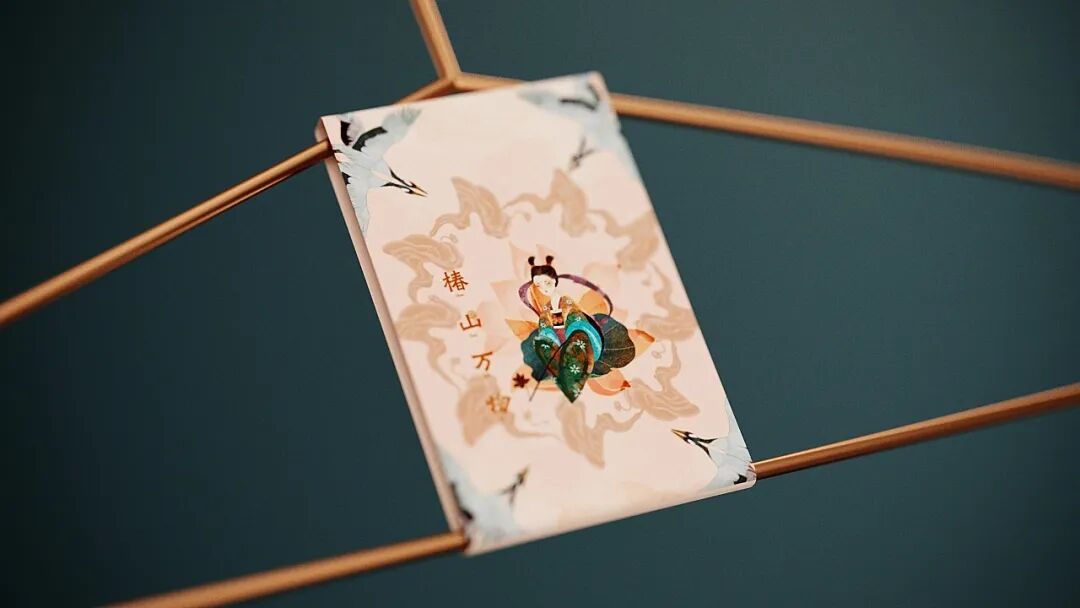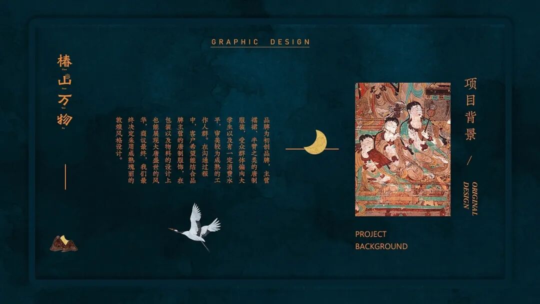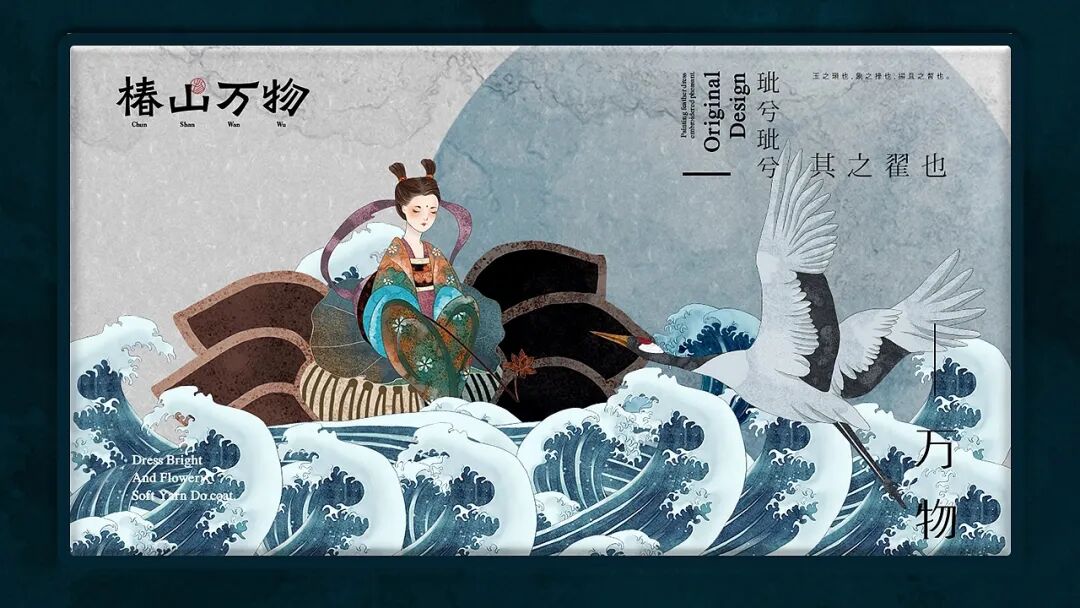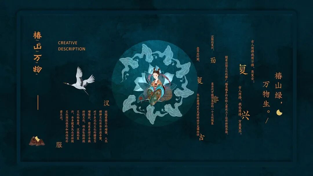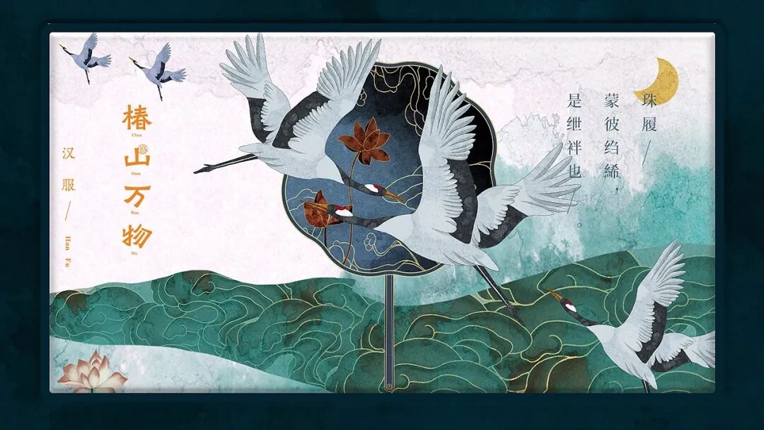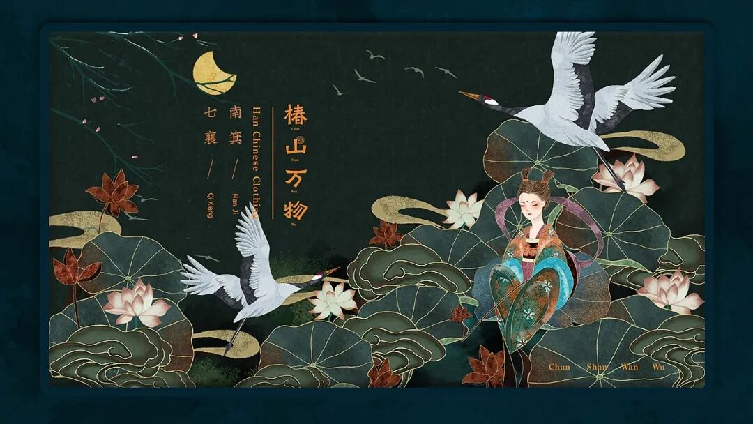 《 椿山万物 》汉服原创品牌,设计上以敦煌文化为创意灵感,插画以一对飞天童子人物形象为主题,配合浮云、金莲、风荷、仙鹤、青山等元素,构建一幅幅瑰丽辉煌的画卷,并以汉服为载体,现华夏文化之精深。