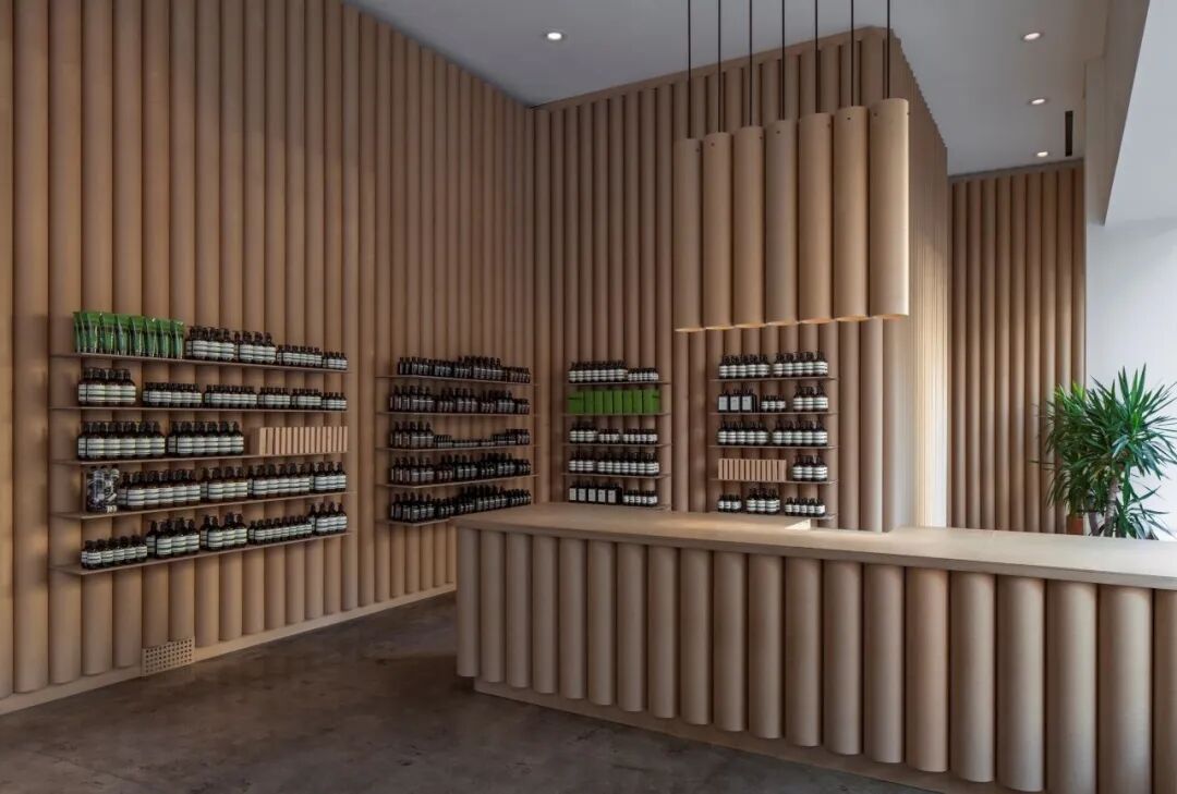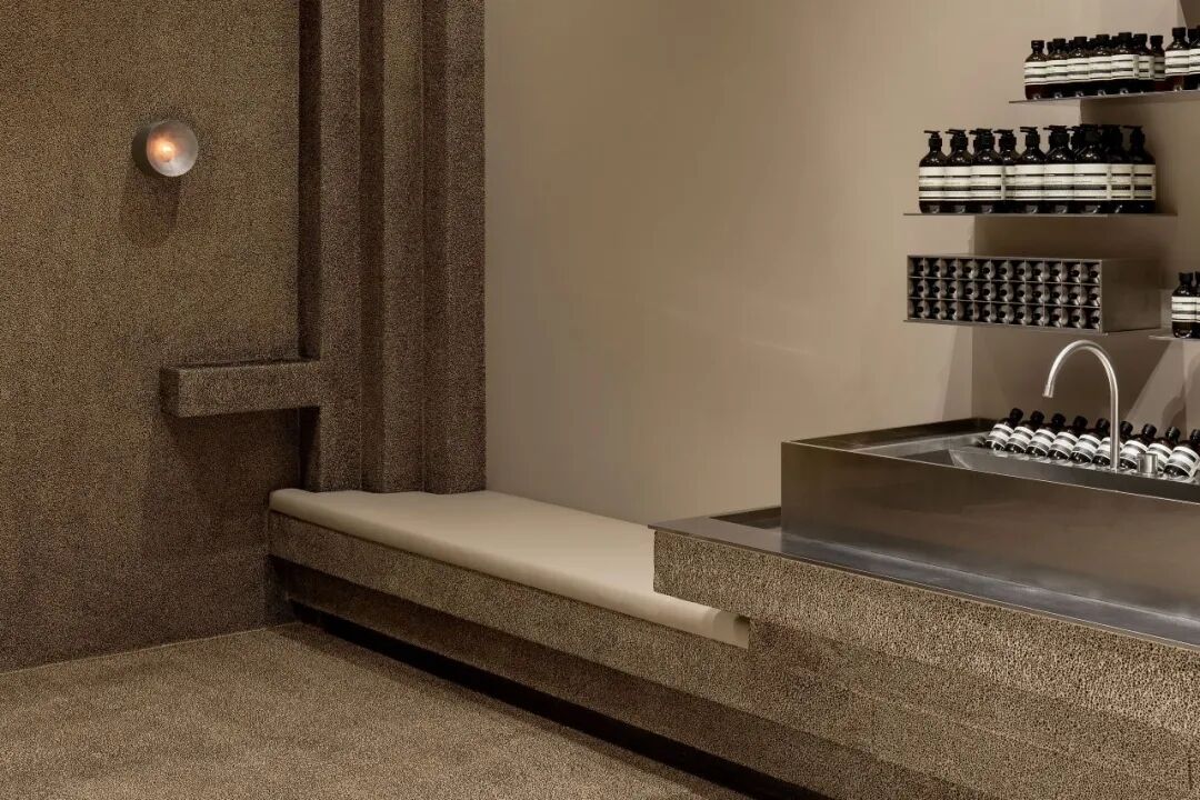Aēsop伊索每到一个城市开店,就会在当地取材并用于店铺设计中,比如澳大利亚柯林斯路店曾选取当地的山羊毛制成地毯,台湾新竹店则运用了当地天然沙砾、玻璃与工艺制成内部墙壁与台面。
