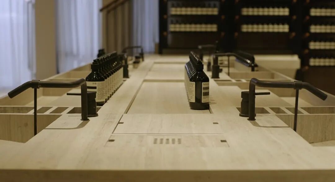 不难注意到,Aēsop伊索每家店的水槽,甚至水龙头都根据本地特色特意设计过。据资料,最初是因为Aēsop伊索的门店设在百货商店里,需要水槽引入流水。这一点也极符合品牌的定位——功能至上,在后来逐渐演变成品牌的标志性设计元素。