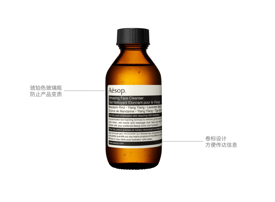 而Aēsop伊索的一大标志,琥珀色玻璃瓶其实是基于实用主义的考量。这种玻璃瓶原本常用于包装啤酒或止咳糖浆,而Aēsop伊索率先将其用于护肤品,并不是为了形式化,而是防止容器中的物品变质,维持产品成分的最高稳定性。