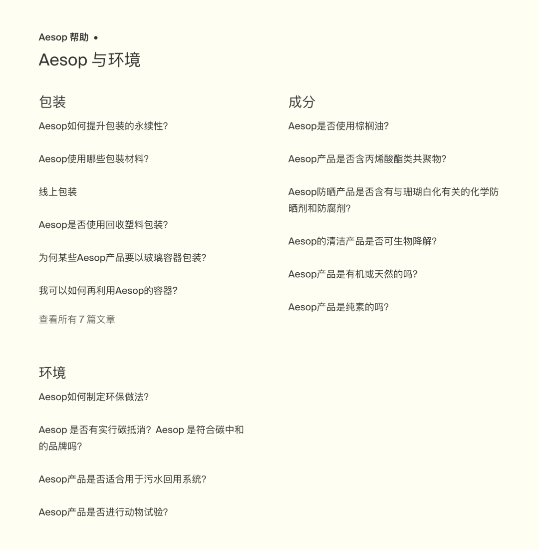 在品牌官网上有一个专门的板块“Aēsop与环境”,介绍了品牌如何将环保的理念践行到各个方面。例如在包装方面,Aēsop伊索尽量减少塑料的用量,在确定产品成分稳定的情况下也会选择回收塑料或铝制容器进行包装。