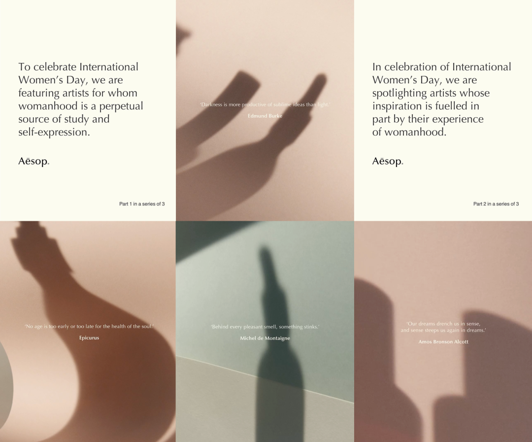 同时,Aēsop伊索的产品拍摄也是如此,以呈现产品为主,没有夸张的拍摄角度和置景喧宾夺主。