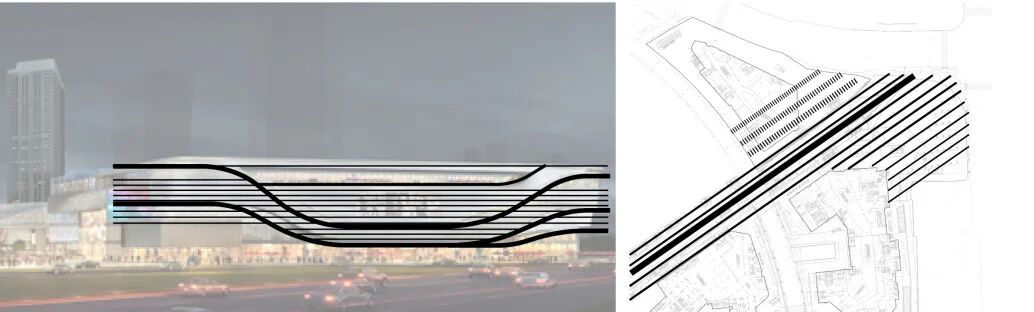 本地块作为项目三个地块中最高端奢华的购物中心,建筑风格现代简洁。建筑立面的横向线条元素基底,结合起伏变化的大轮廓,结合穿插的方形体块,充满构成感,富有韵律和艺术感。材料使用落地玻璃结合冷灰色铝板,点缀金色线条,奢华大气。