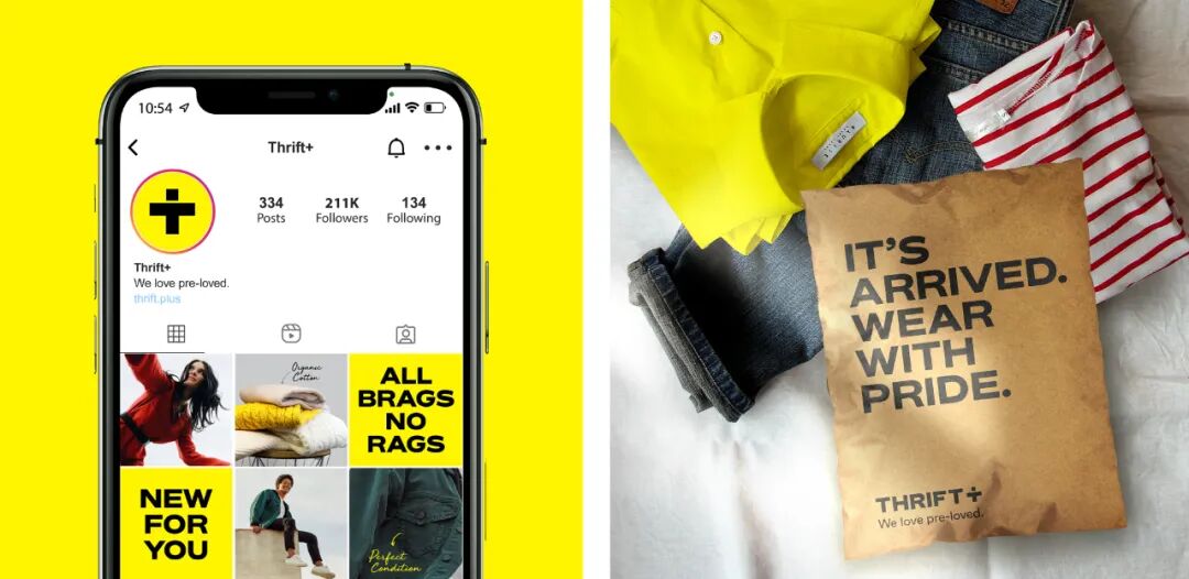 从鲜艳的黄色到大胆的字体和视觉,Thrift+充满自信交流,可以帮助消费者克服购买二手商品的一些关键障碍。同时黄色也体现了乐观(对未来)价值。