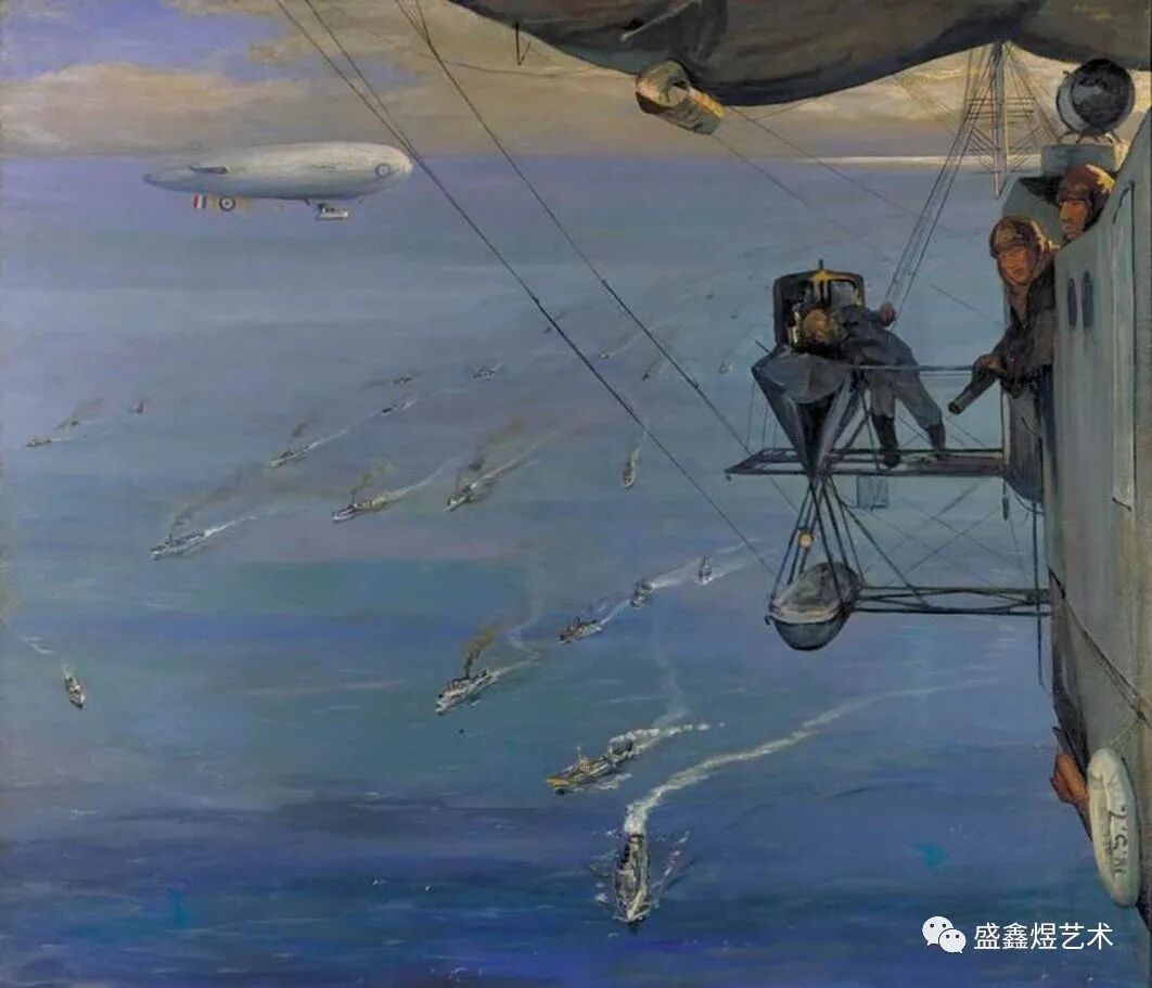 与William Orpen一样,约翰·拉维里在第一次世界大战中被任命为官方艺术家。然而,身体不好使他无法前往西线。齐柏林飞艇空袭期间的严重车祸也使他无法履行战争艺术家的职责。他留在英国,主要画船、飞机和飞艇。在战争年代,他是阿斯奎斯家族的密友,并在萨顿考特尼泰晤士河畔的住所与他们共度时光,为他们画肖像和田园诗般的图画,如河上的夏日(休莱恩画廊)。