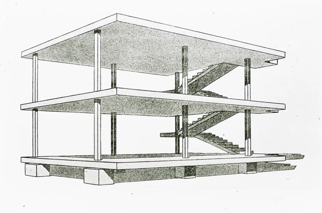 柯布西耶的模型提出的这种结构由混凝土板组成,边缘由最少数量的薄钢筋混凝土柱支撑,楼梯提供通往每一层平面图的通道。框架完全独立于平面图,从而为设计内部配置提供了自由,模型消除了承重墙和天花板的支撑梁,它所描绘的图纸和设计为现代建筑中的开放式平面和幕墙立面奠定了基础。