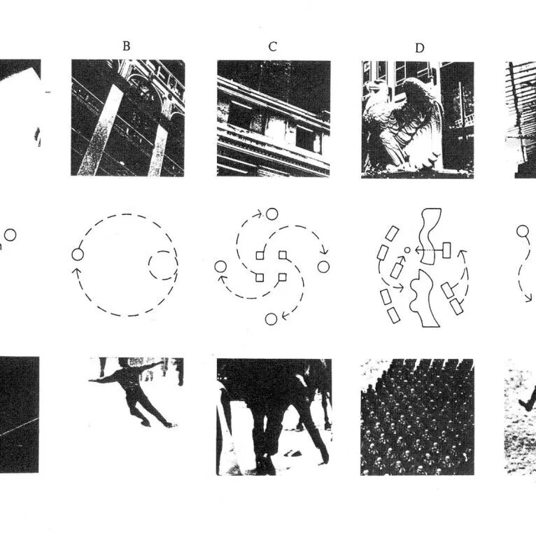 同时,平面图、剖面图和图表勾勒出空间,并指示闯入这个建筑“舞台布景”的不同主角的动作。草图的明确目的是转录通常从传统建筑表现中移除的事物,即空间与其使用之间、场景与脚本之间、“类型”与“功能”之间以及对象与事件之间的复杂关系。这些类型的图像表明,建筑图纸可以超越三个维度的表示,包含第四个维度——时间。