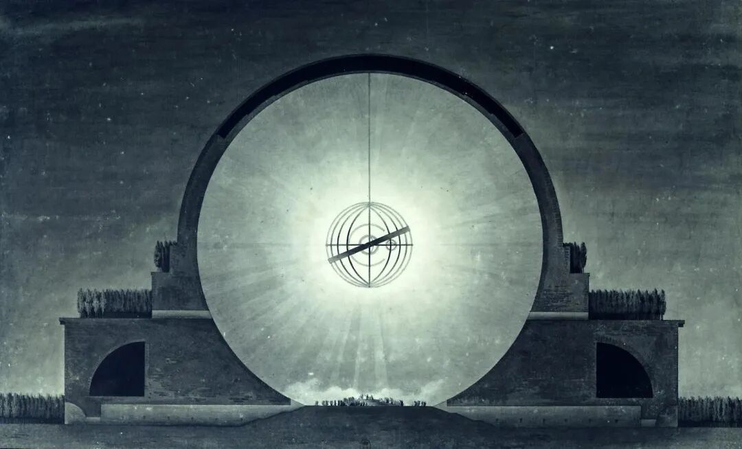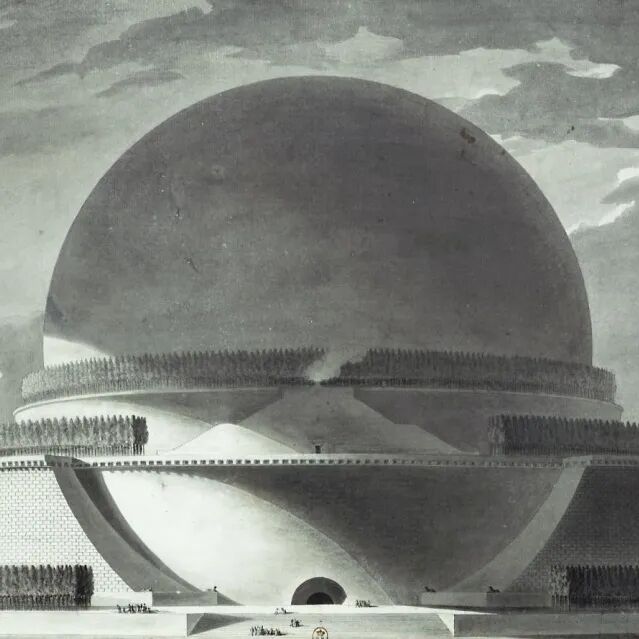 拟建的其中一个建筑是152米高的球体,环绕着两个大型基座和数百棵柏树。尽管结构从未建成,但Boullée在1784年雕刻了许多水墨画并在专业界广为流传,设计中对光的使用使建筑的内部在白天和晚上都发生了变化,这在为纪念碑创作的一系列部分中最容易理解。