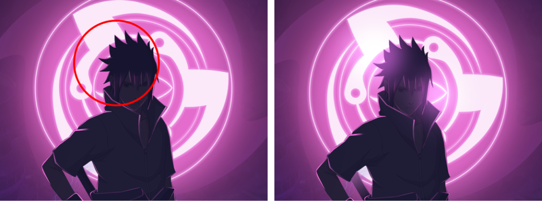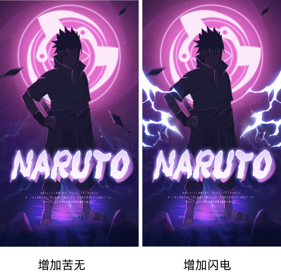 很多同学丰富画面的时候不知道加什么,其实是没找对方法,我们可以从主要人物出发去联想发散。比如这是火影忍者的佐助素材,那佐助的技能,忍者的道具都是我们可以利用的。比如千鸟的闪电,苦无,飞镖之类的。