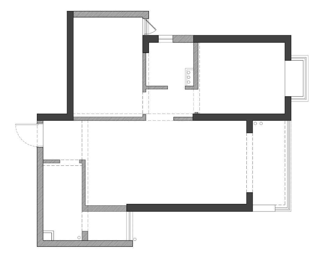 第二条洄游动线:根据常住成员需求和空间特点,拆除次卧单面墙体,卫生间干湿区拆开,干区独立外置,有序的“让”出原本不存在的卧室过道、入户鞋帽区,完美避免鞋柜面向餐厅的尴尬。