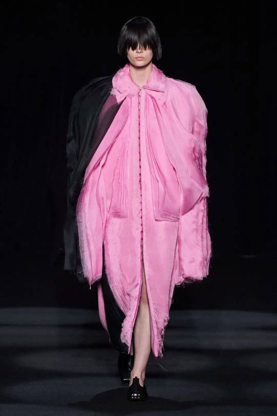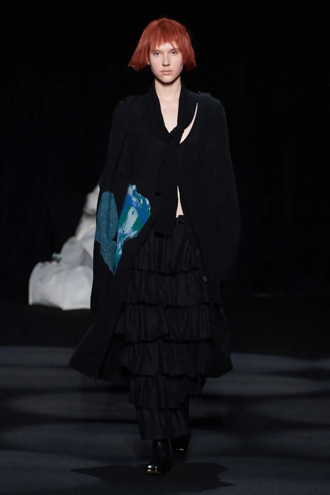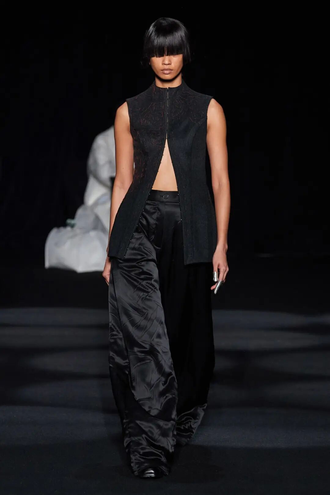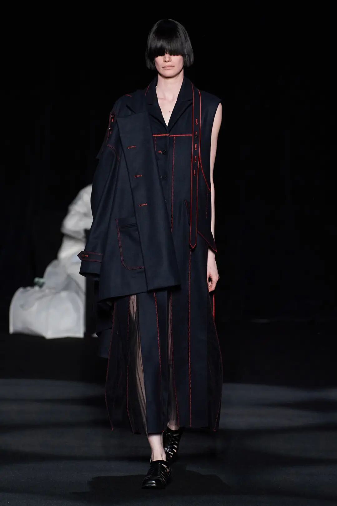 在时装秀的大部分时间内,舞台上都放置着一张黑色的床,可以看到许多与床有关的元素出现在服装中。