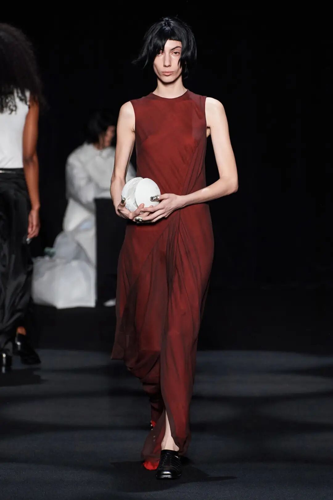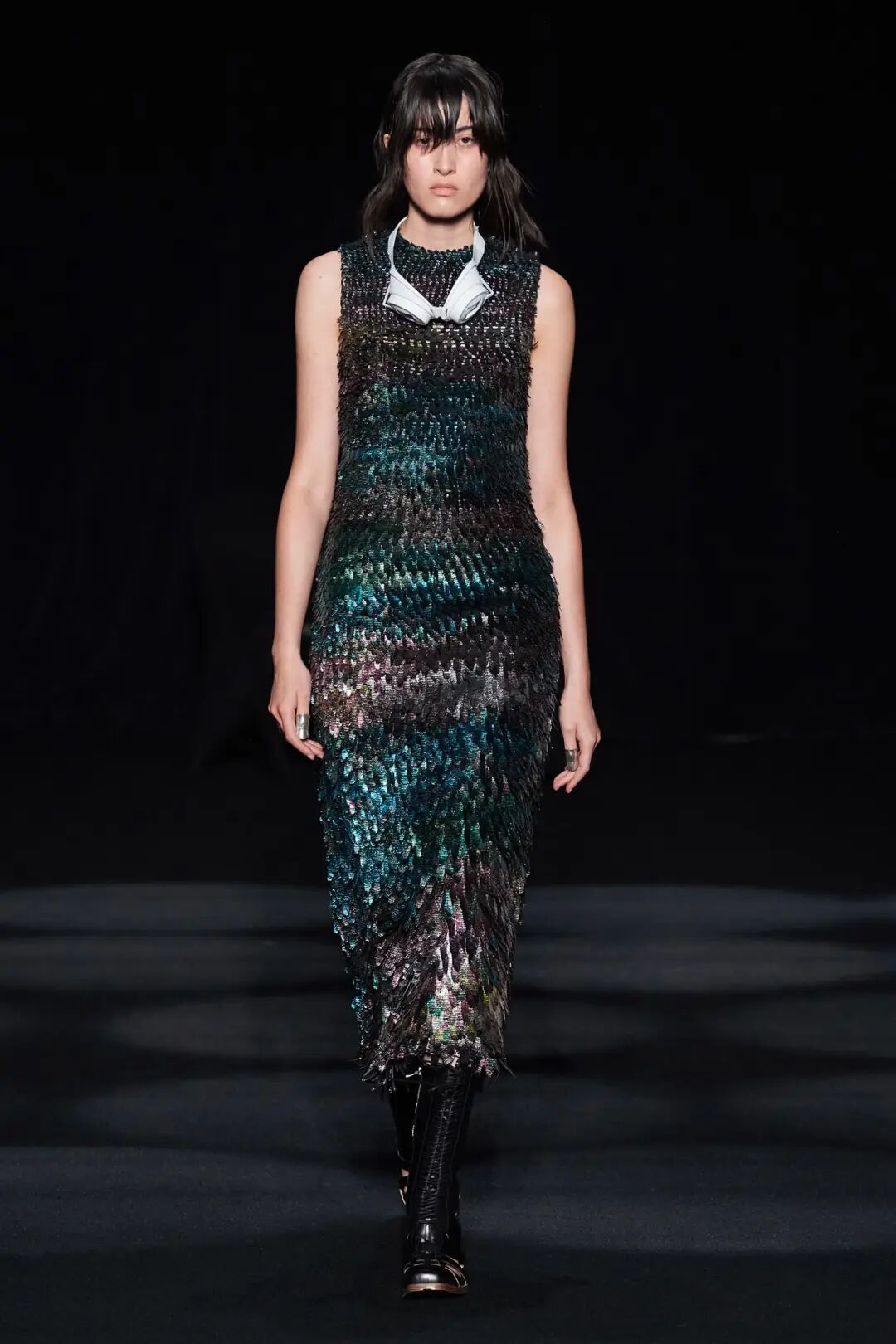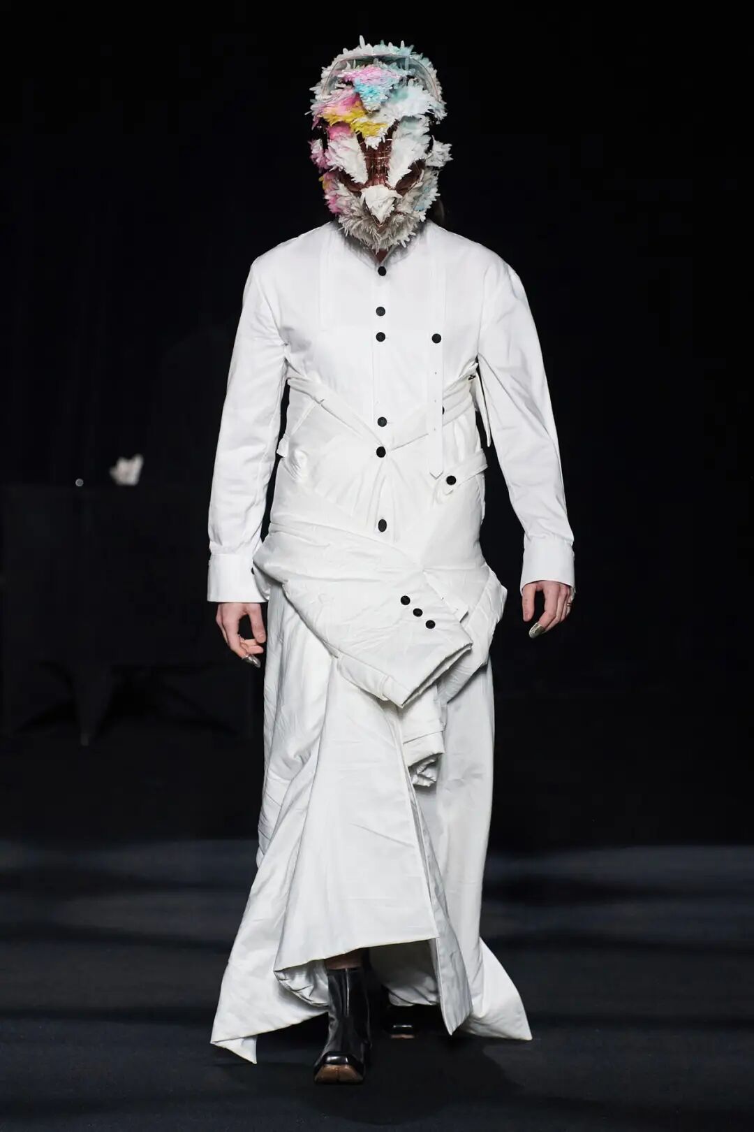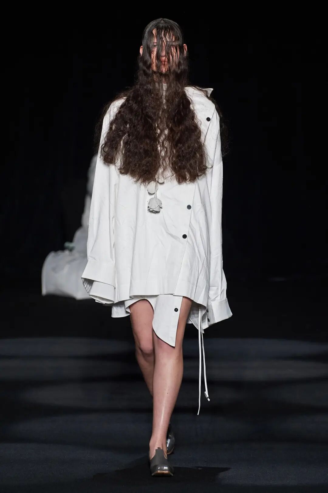 在时装秀的大部分时间内,舞台上都放置着一张黑色的床,可以看到许多与床有关的元素出现在服装中。