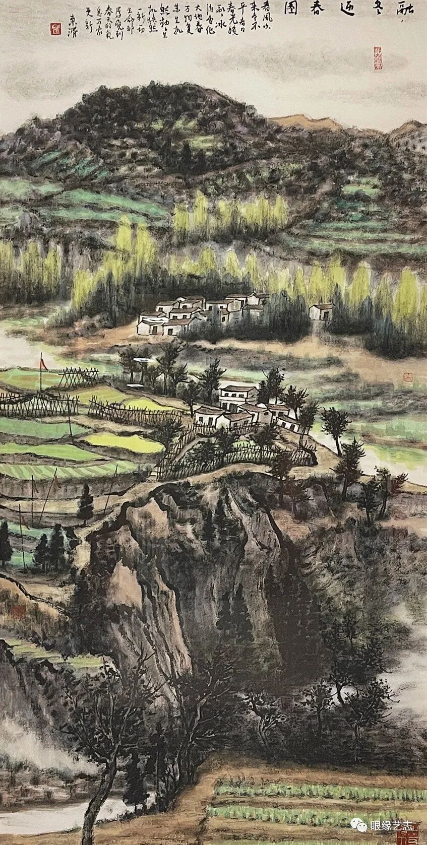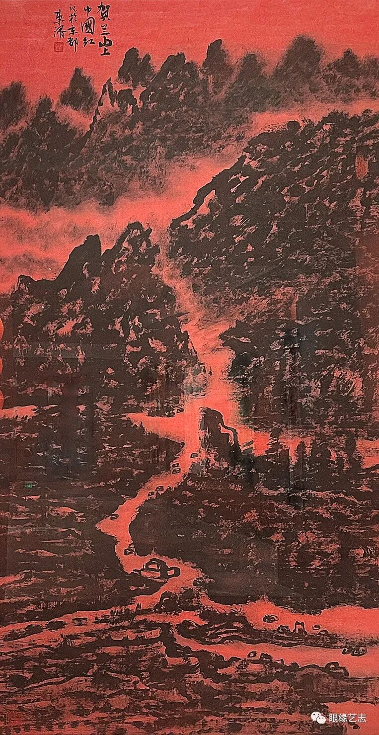此次展览展出的崔东湑作品,浓墨重彩于对新时代与新篇章的深入刻画。画作中的春之意境,傲而不俗,将初春的盎然生机尽现于笔端。文脉的背后是人脉的生生不息,是血脉的骨肉相连,从《融冬迎春图》的山田秀翠到《高原春色》的乡土绿意,从《黄土高原上迎春雪》的窑洞银装到《贺兰山上中国红》的赤墨交融,一地一色,参差相连。华夏大地,锦绣山河,在崔东湑的笔下浑然且清晰,方寸之间,尽览神州新春。