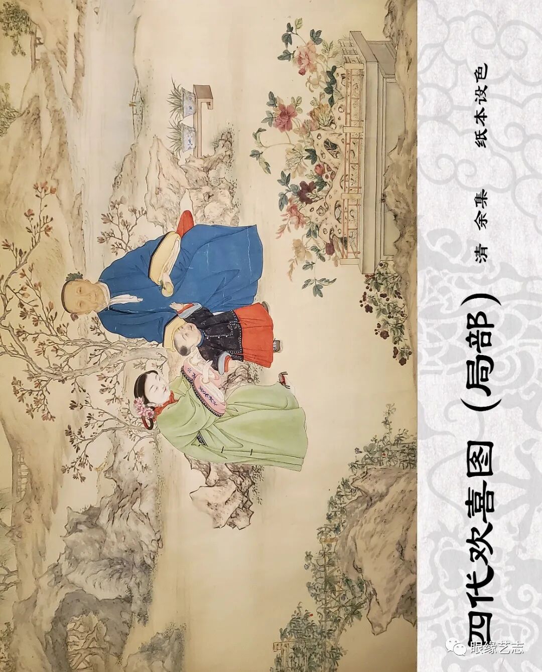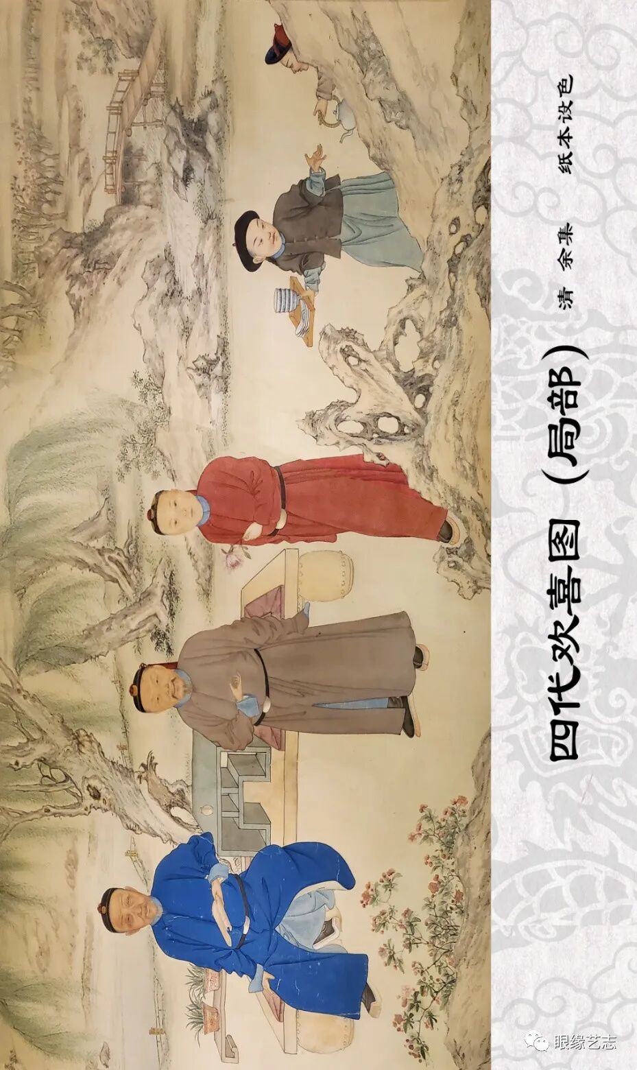 在清代余集的《四代欢喜图》中,山石树木都被画者安置在人物活动的情境里,对人物的描绘工整严谨,以细线勾勒五官,呈现出略带微笑且神情自然的状态。