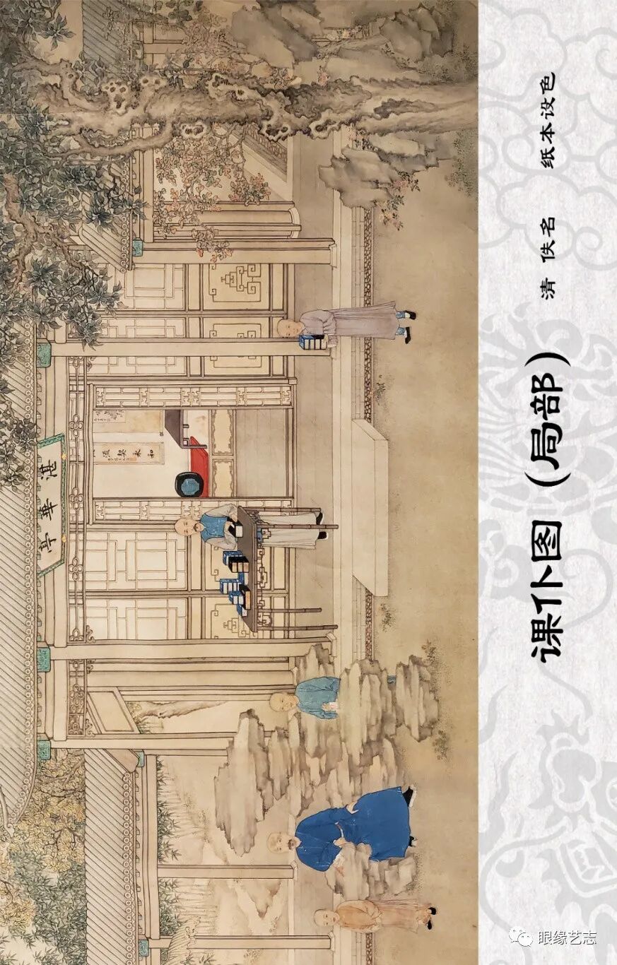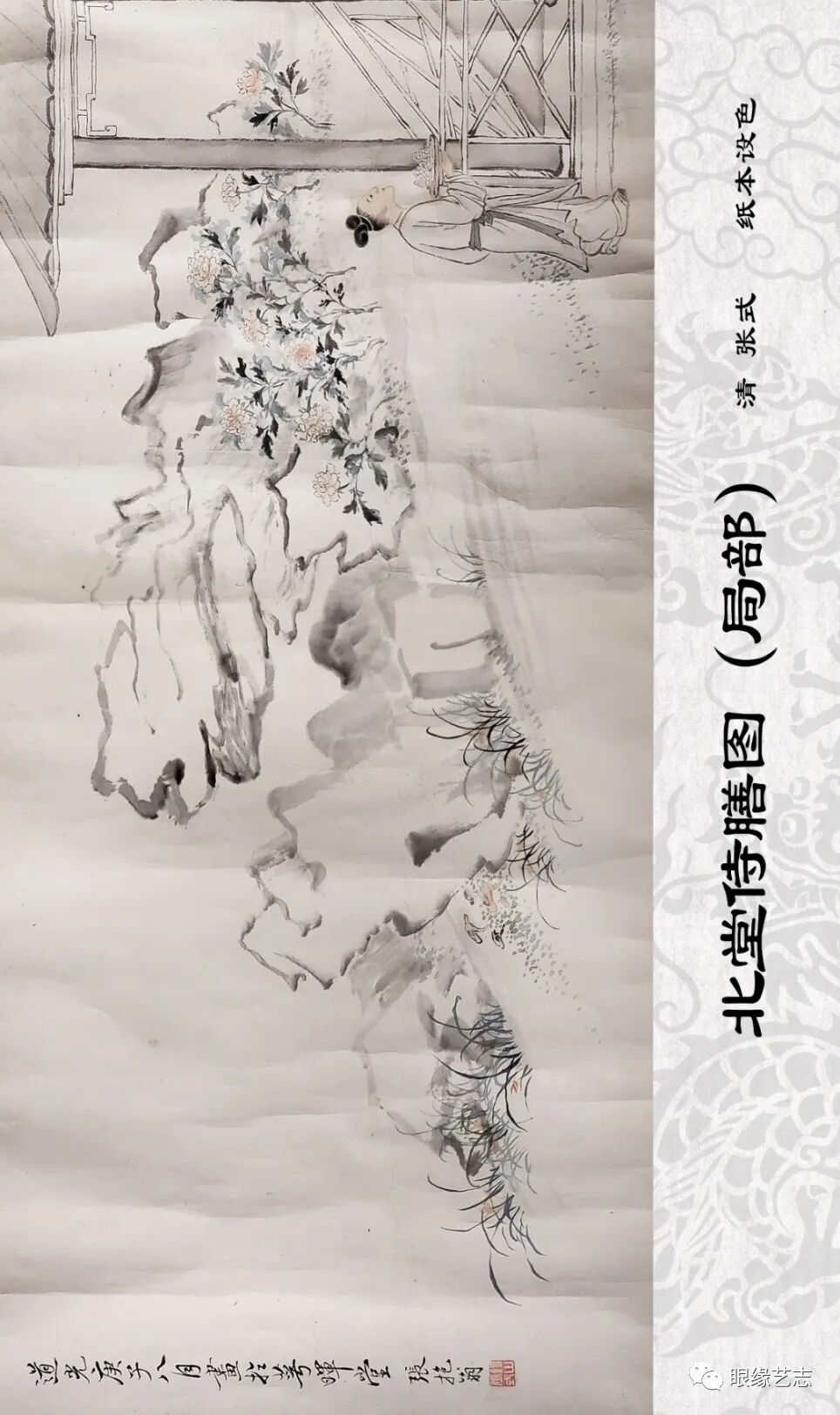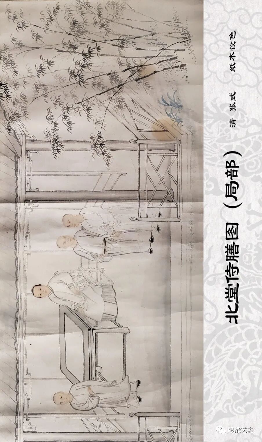 在清代张武的《北堂侍膳图》中,画家于平中求奇,境界宁静优雅,充溢着平和怡适的情调。他遵循传统绘画技法,先以淡墨勾勒面部轮廓,并以淡彩层层推进,局部再精细渲染。整体构图上增添了些许文人气息,同时吸纳光影、透视等西方绘画技巧,呈现出更加写实与具象的面貌。