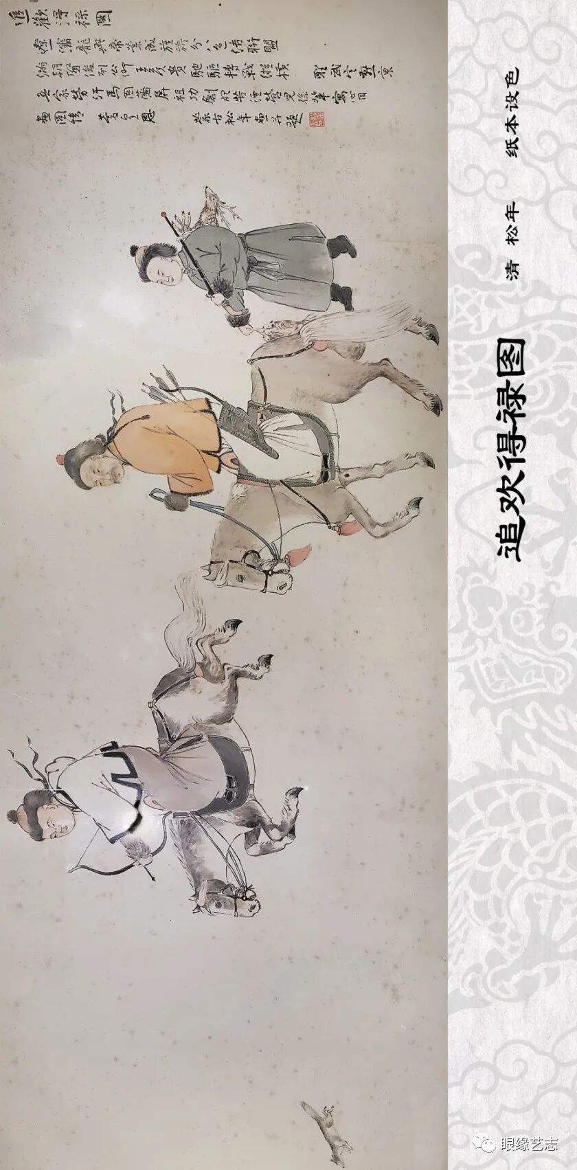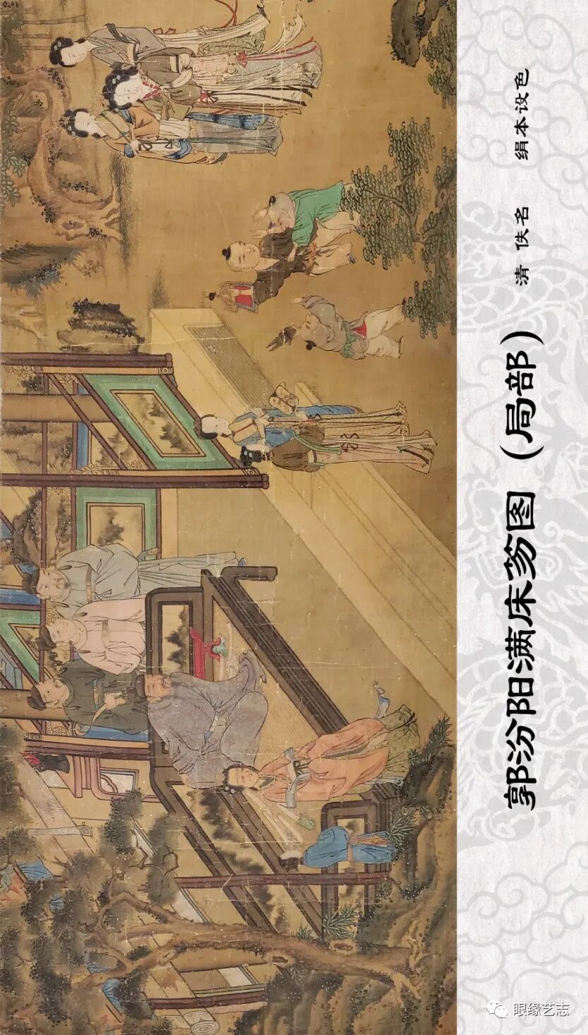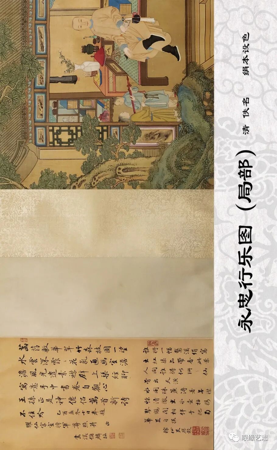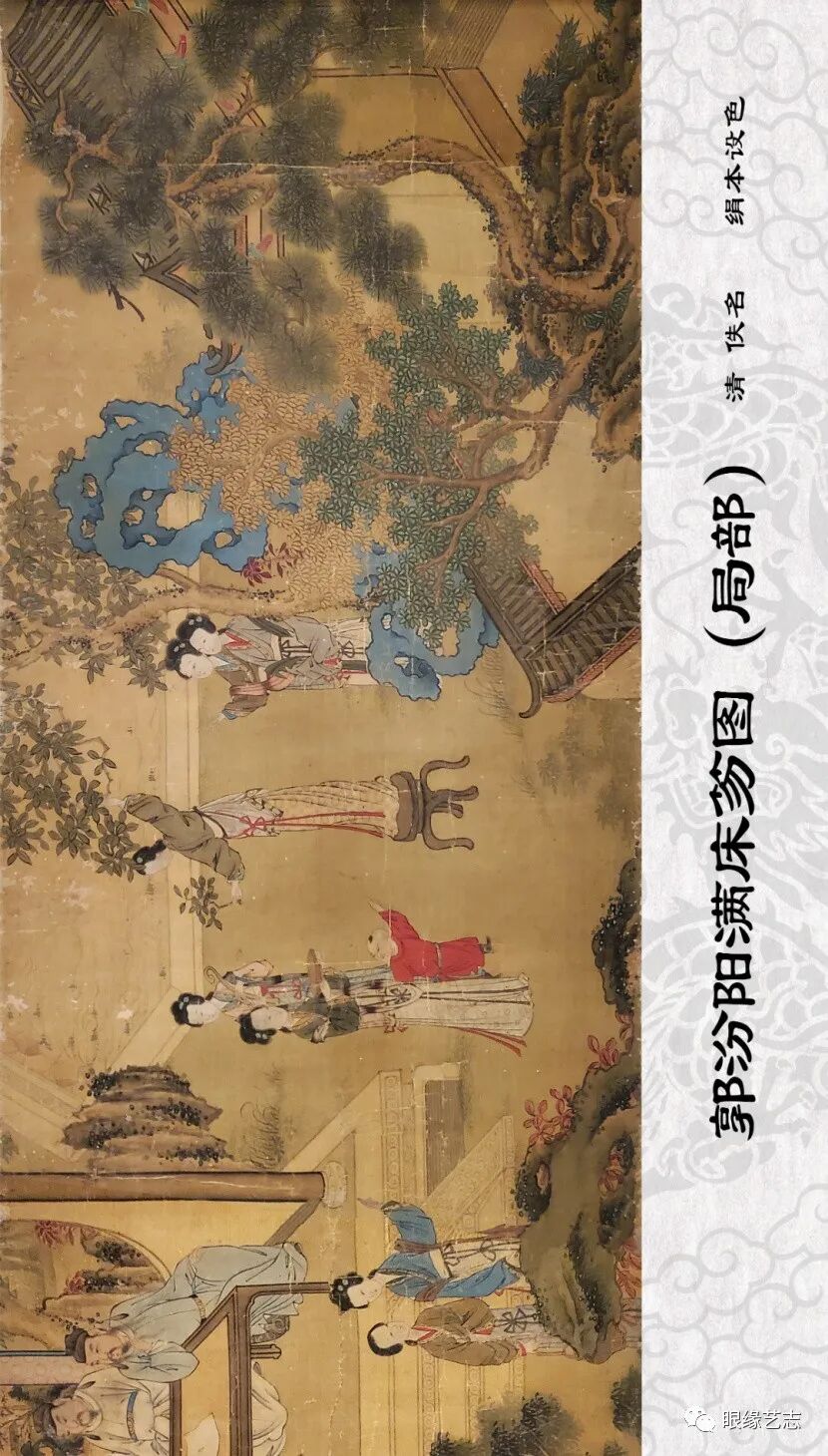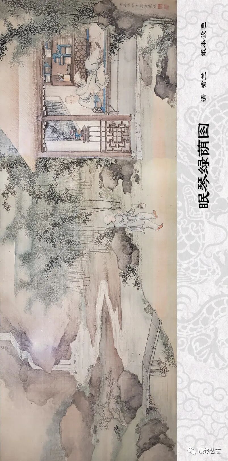 此画引首处题隶书“强恕堂四代欢喜图”八字,图中绘一家四代在山水园林中欢喜共聚、尽享天伦之乐的场景,落款“秋室集”,卷后有清人翁方纲、董诰、陈嗣龙、汪滋畹等题跋(展览现场卷轴并未完全放开,遂未见引首与落款)。