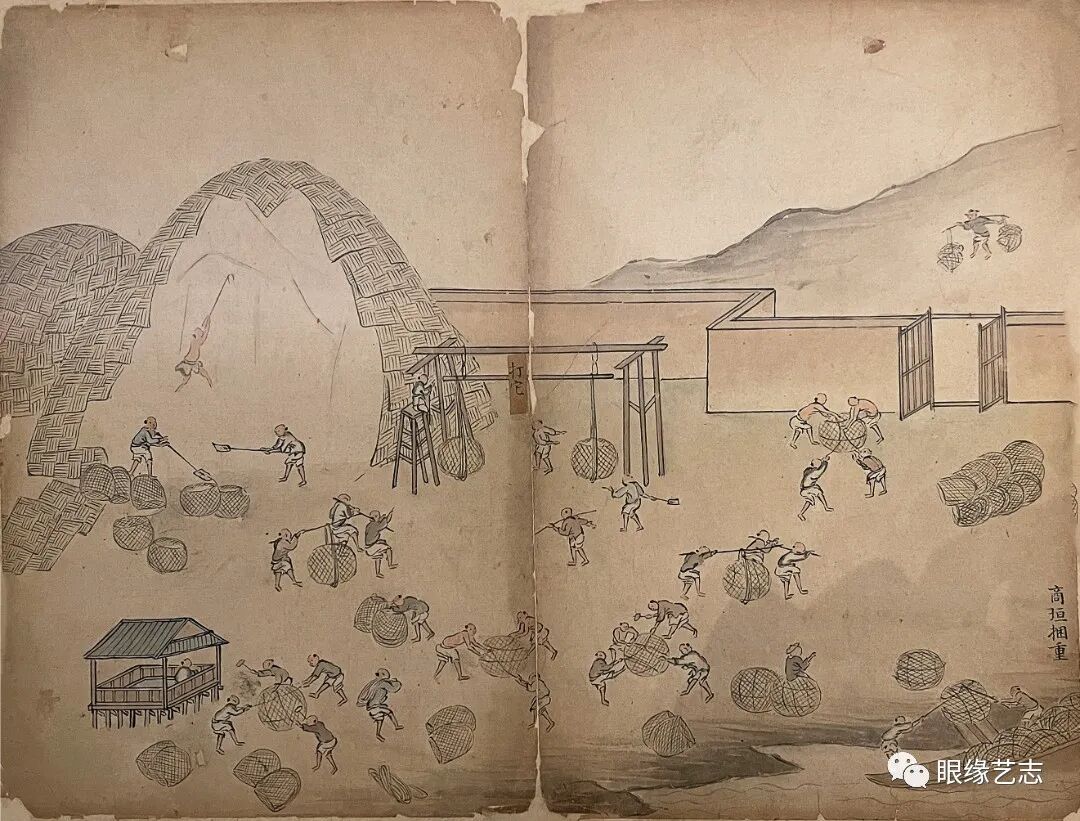 此次展览展出了清《淮盐场图册》。据史料记载,两淮盐场是中国古代最重要的海盐产地,以淮河为界,分为淮南盐场和淮北盐场,素有“两淮盐税甲天下”之说。该图册虽古朴简单,却也真实记录了清代两淮盐场的盛景。图册采用了传统山水画的技法,以俯瞰式角度呈现,作品结构刻画精细,具有界画笔意。