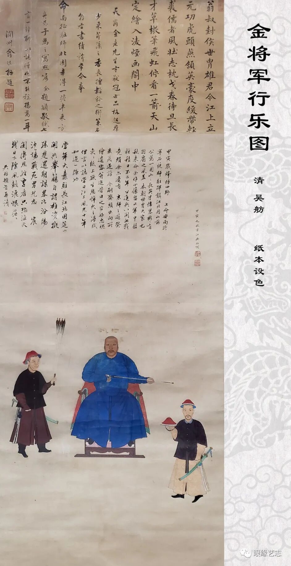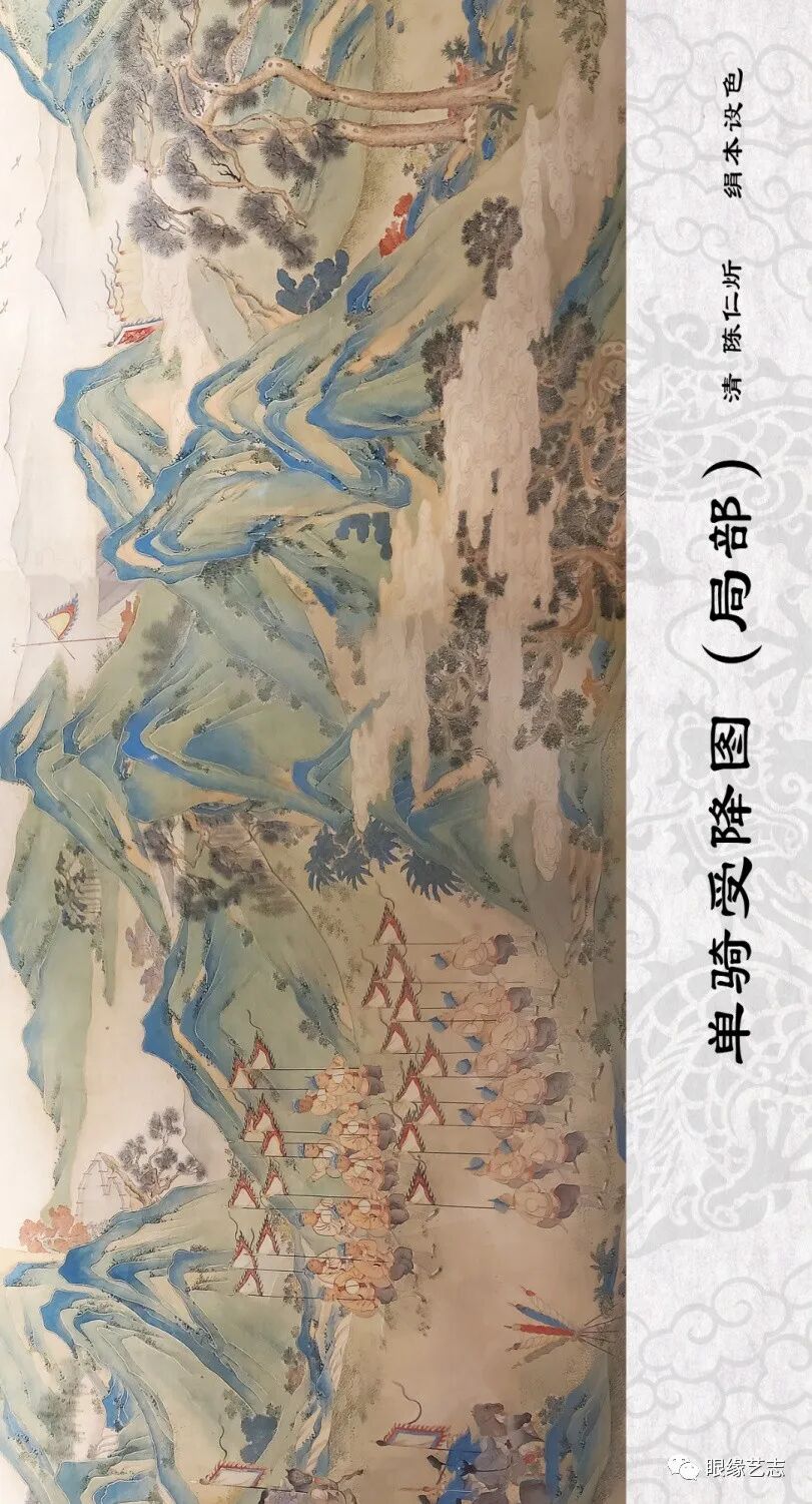 这一时期的诸多作品惯以重大事件为创作主题,旨在颂扬皇帝功绩和记录帝国征战平乱的一系列纪实性、叙事性宏制巨构。如此次展览展出的陈仁炘的《单骑受降图》、严纪的《行军图》,都显现出了规整化一的拘谨气度。