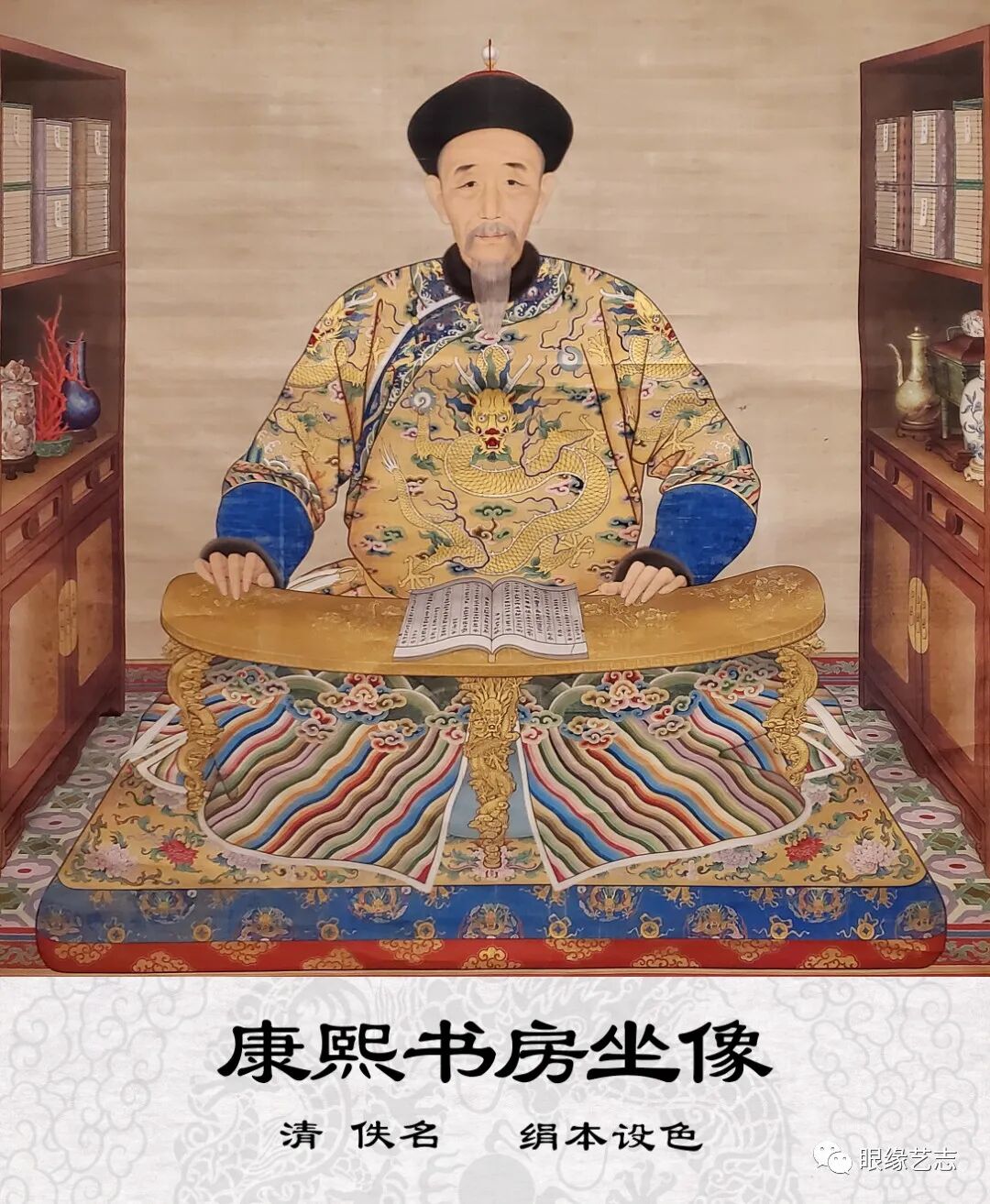 这幅《康熙书房坐像》是此次展览众多画作中最为精巧的一幅。画中的康熙皇帝面容清瘦,须眉花白,头戴黑色貂皮珠冠,身着黄色锻地吉服袍,盘膝坐于铺设锦垫的床榻上,双手轻按面前的绘金漆琴式三足案,案上的书本意在表明康熙此时正在阅读。康熙的左右两侧是形制一致的书槅,各色古玩器物、书籍陈列其上,既彰显了帝王尊贵的地位,也诠释了其高雅好学的品位及美德。整幅作品设色华丽,庄严肃穆又不失生活气息。古代宫廷画家绘制此类肖像画有着纪功、颂德、表行的作用,作品大多线条细腻,设色贵丽,独具韵味。