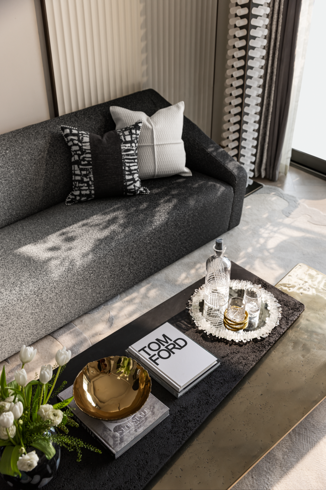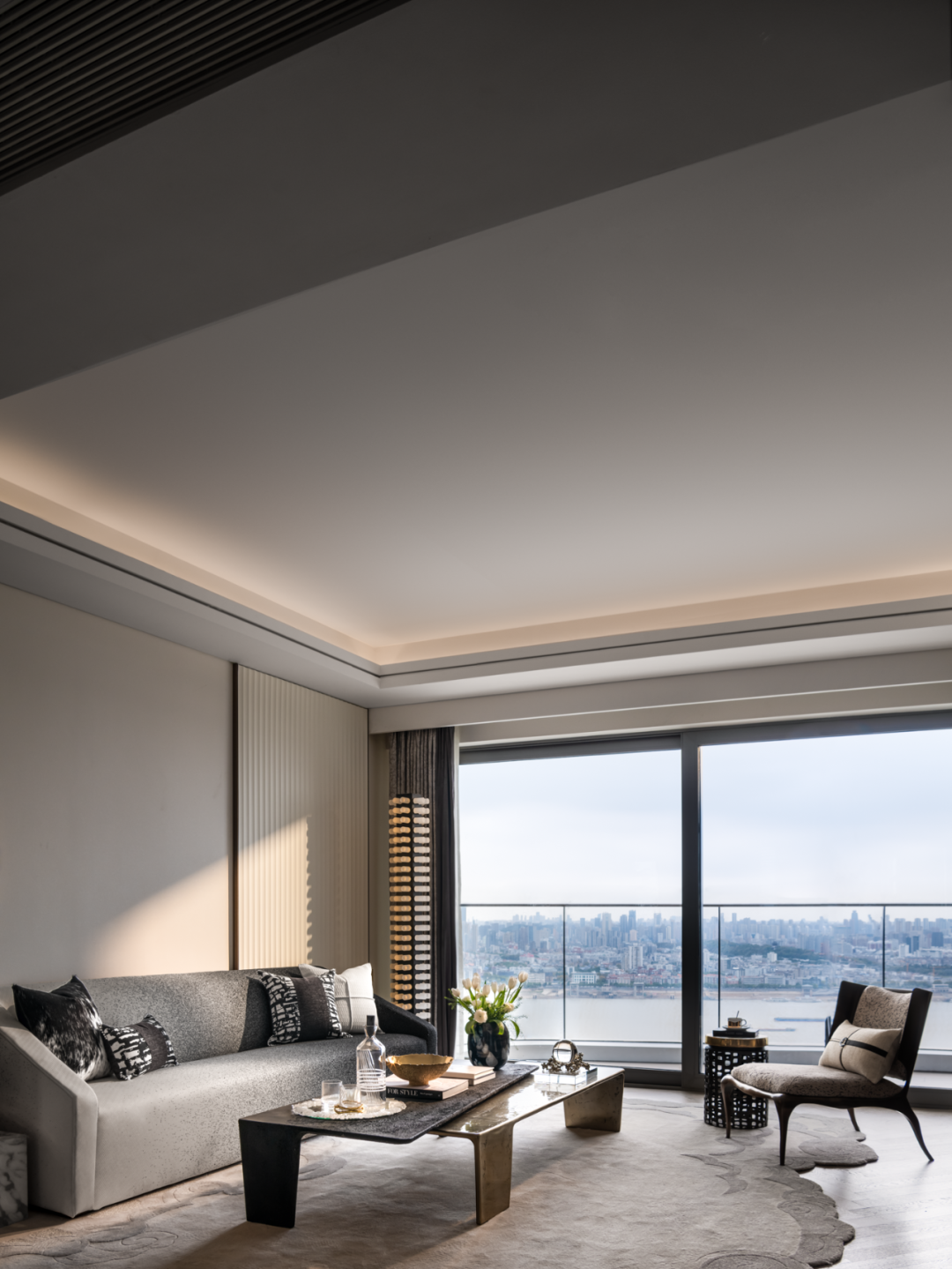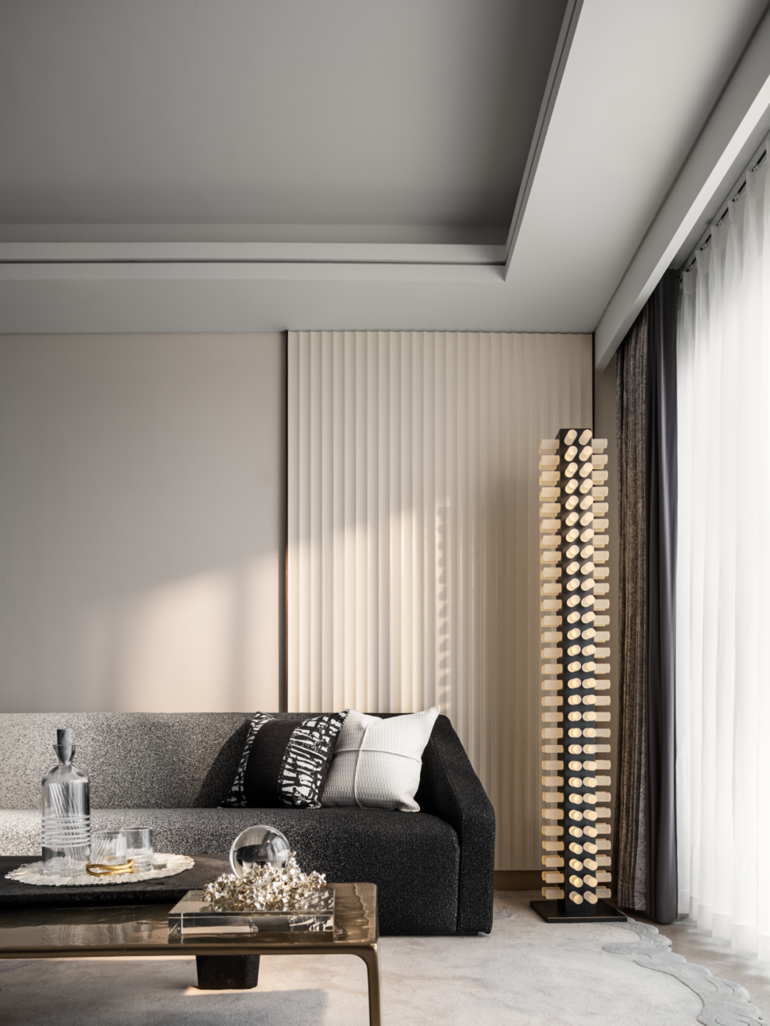 原创设计品牌why的艺术落地灯、手工锻造的黄铜材质单人沙发与意大利品牌visionnaire的茶几搭配,在极简构成设计的理性国度,一同为游历者的故事叙述提供着最舒适的聆听气氛。以黑白灰作为主基调,暖灰色的软装整体色调与硬装基调相呼应着,展现出追求非凡的价值感。