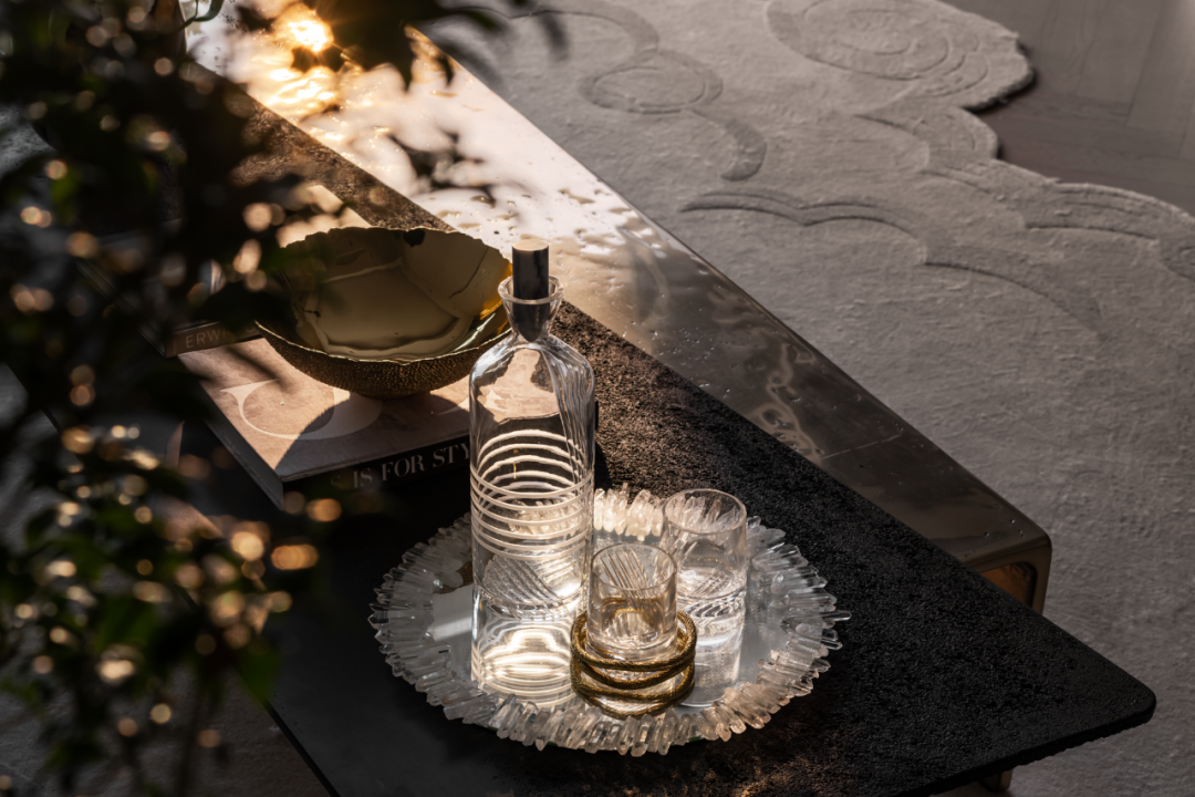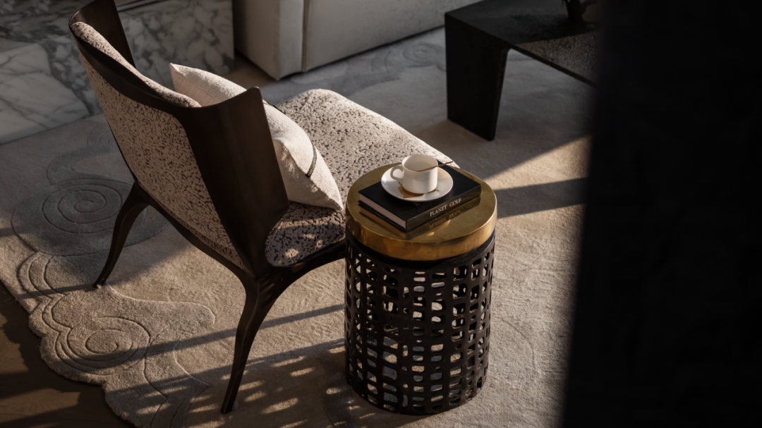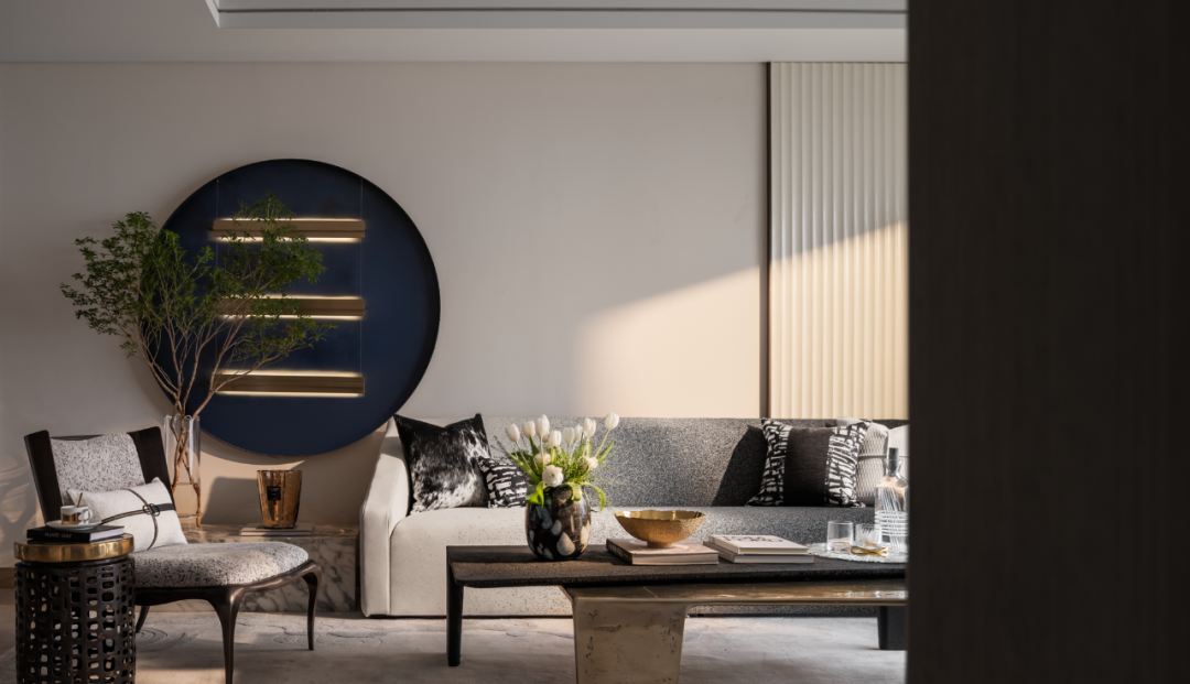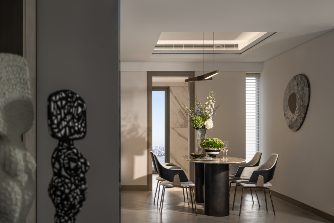 原创设计品牌why的艺术落地灯、手工锻造的黄铜材质单人沙发与意大利品牌visionnaire的茶几搭配,在极简构成设计的理性国度,一同为游历者的故事叙述提供着最舒适的聆听气氛。以黑白灰作为主基调,暖灰色的软装整体色调与硬装基调相呼应着,展现出追求非凡的价值感。