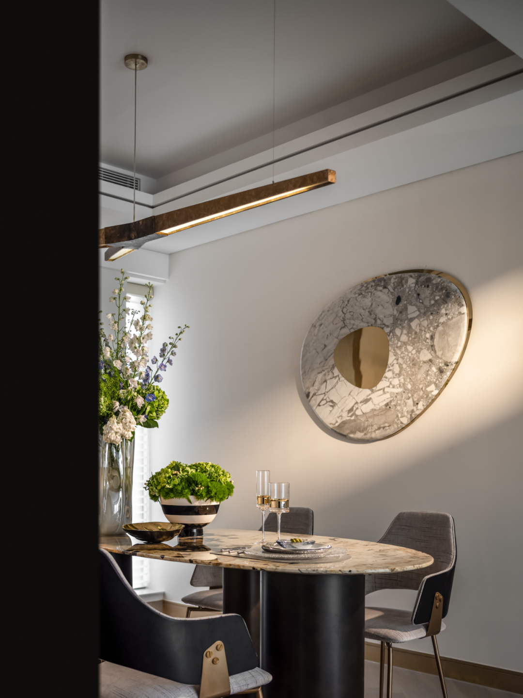 现代主义自然粗犷激进,但如果坐在依然可辨认巴洛克基因的椭圆餐桌(潘多拉奢石台面的餐桌)旁的低扶手皮艺餐椅里,用一杯开胃红酒启动对味蕾的犒赏。不可或缺的高端酒具与进口琉璃花器正是“活色生香”的导演。过道墙壁上皮艺装置画与射灯的光形则依旧续写着空间的诗篇。