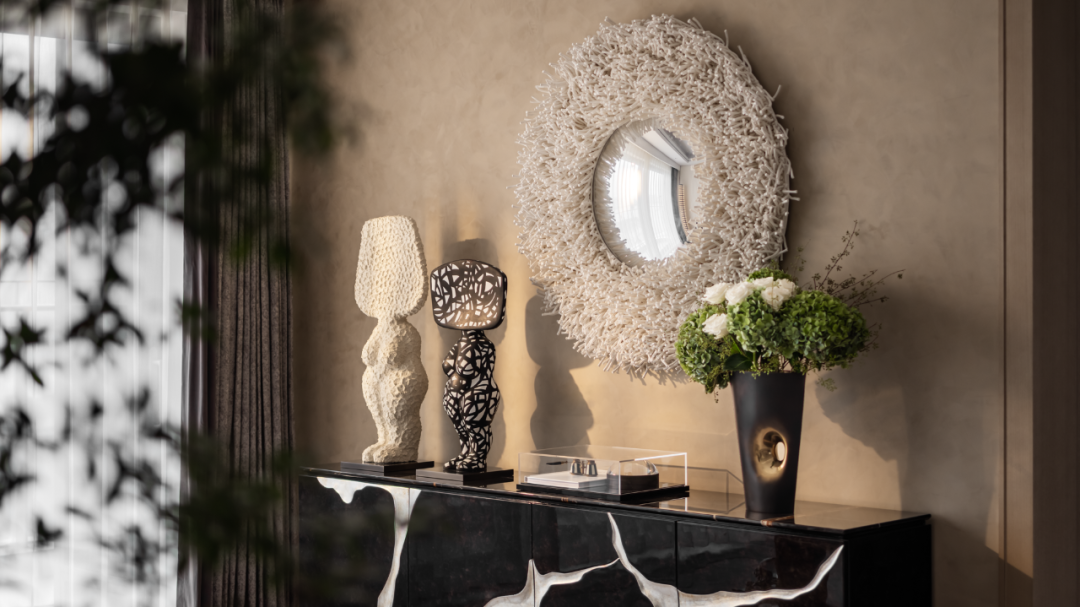 房主人显然早已熟悉ANGEL、George Jensen、René LALIQUE等艺术品牌的不凡格调,琉璃与金属并重的重量感足矣提升整个空间的品质感与高雅气度。让激情洋溢的现代派艺术品“心归野趣”,展现玄关的奥妙,让自然与艺术一同迎接正要归隐的主人。唯有出自Kelly这样灵感敏锐的设计师之手,才会成为可燃点房主心灵城堡的那盏壁灯,优雅自然的设计理念也唯有天然矿石的线形勾勒才是绝佳的诠释方式;金色铜艺装置艺术画配以考究的花器,与对称的矿石壁灯相得益彰,使身临玄关处更具有仪式感。完全可以用“精神漫游”来形容客厅内的一切。的确,这里是主人展示或自赏个性喜好以及故事的私人美术馆,不经意中,孤勇者崇尚越野精神的自然主义之旅在空间中延伸着激扬的主题调性。
