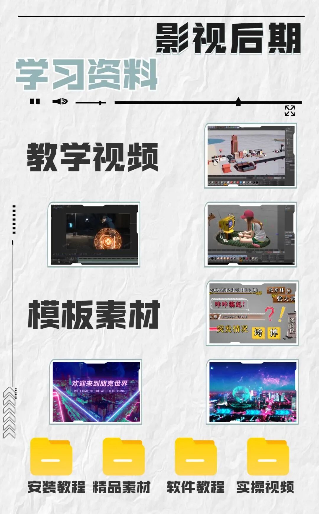 包括:基础软件操作、剪辑基础、音效处理、特效合成、人物建模、动画制作等