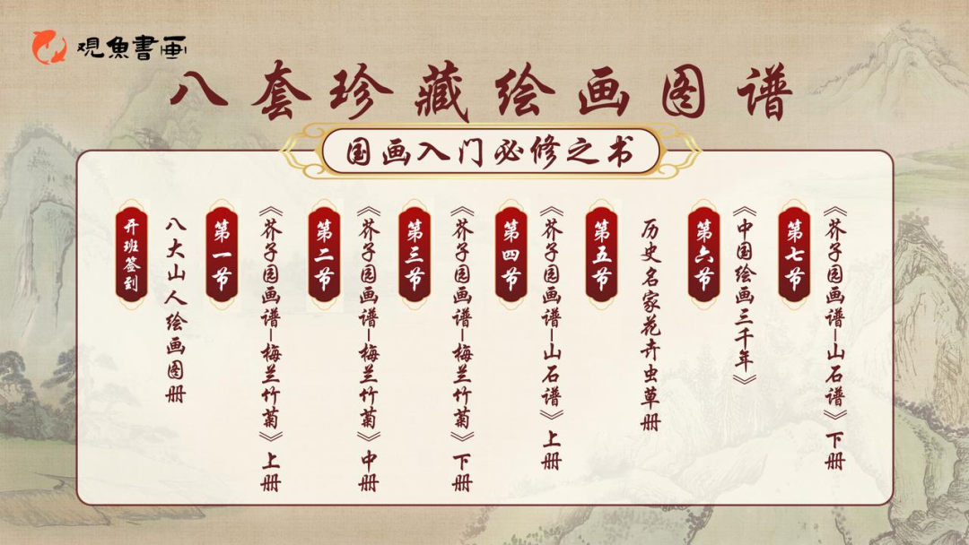 本次课程一共有7节,从入门级-基础级-进阶级,6天让你阶段性提升国画水平;课程包含山水画、花鸟画,每节课都会教你2-3个实用可行的国画技法。