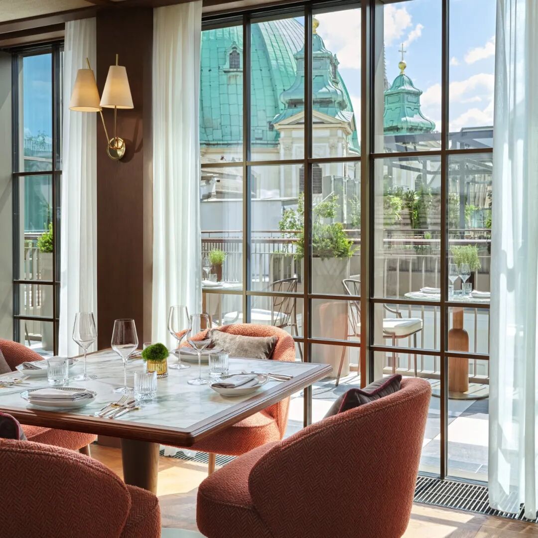 酒店的6、7层的酒吧和法式小酒馆风格的餐饮空间Neue Hoheit 由来自奥地利当地的事务所Kroenland打造,供应地道的奥地利美味。还可以从窗外眺望维也纳老城的壮丽天际线。
