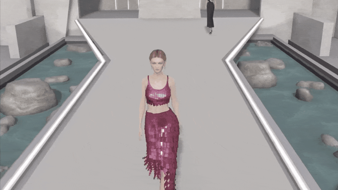 设计方称,展示空间的设计受到了岩石空气等自然元素的启发,T 台跑道与观众之间被两个静态色彩池隔开。在时装秀进行到一半时,池子会变成人造壁炉,虚拟模特则会悬浮到半空中,这一切都是在现实世界的时装秀中无法做到的。
