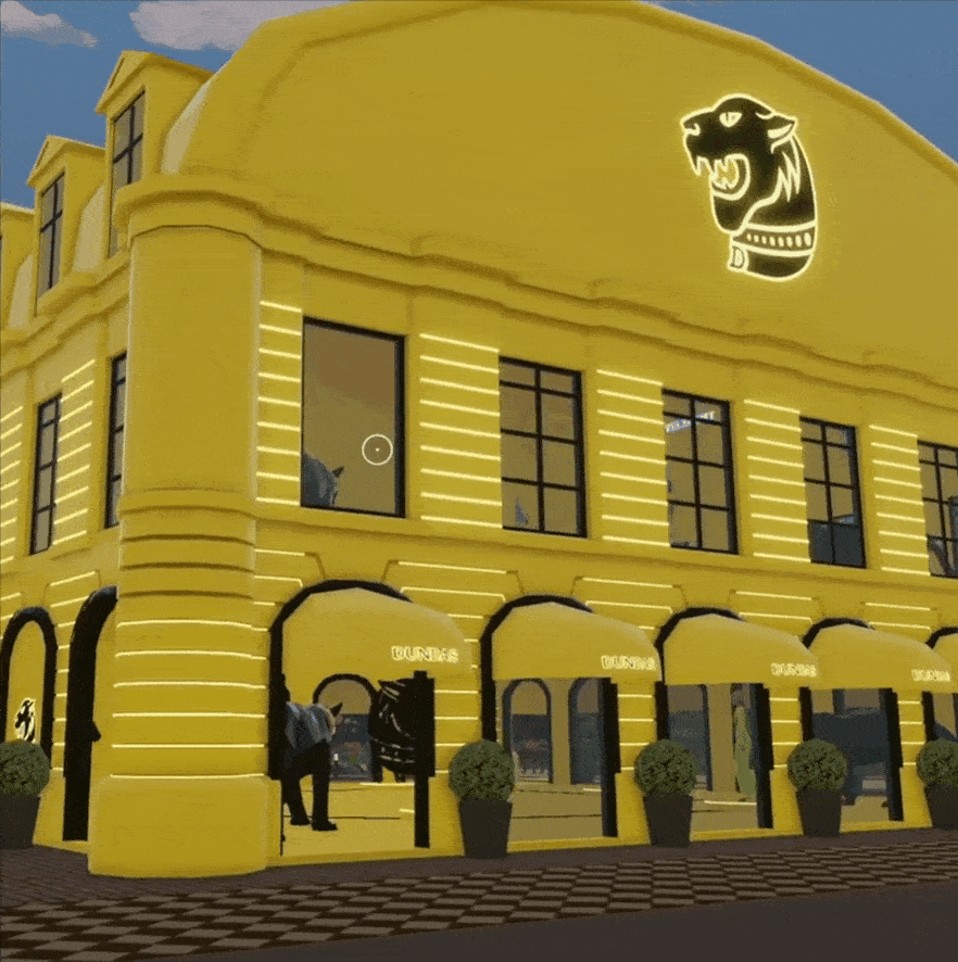 店内摆放着戴着钻石项圈的黑豹和身着 Dundas 数字服装的人体模特。在快闪店内的屏幕上,游客们可以看到正在播放的来自真实世界的视频广告。