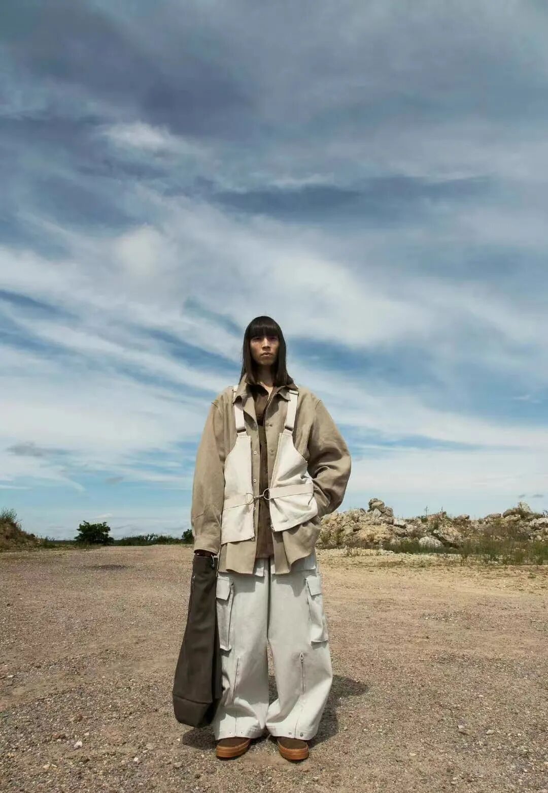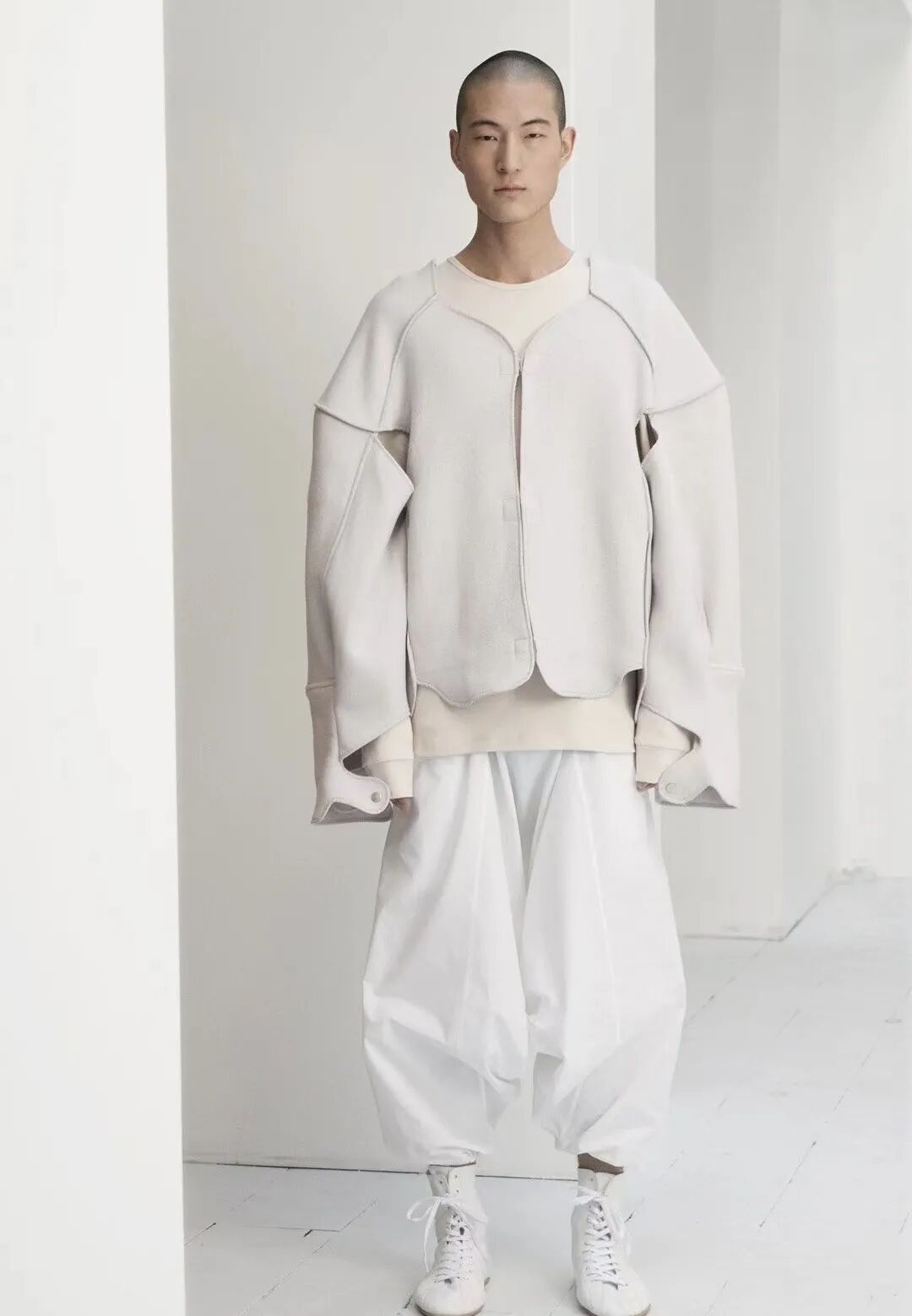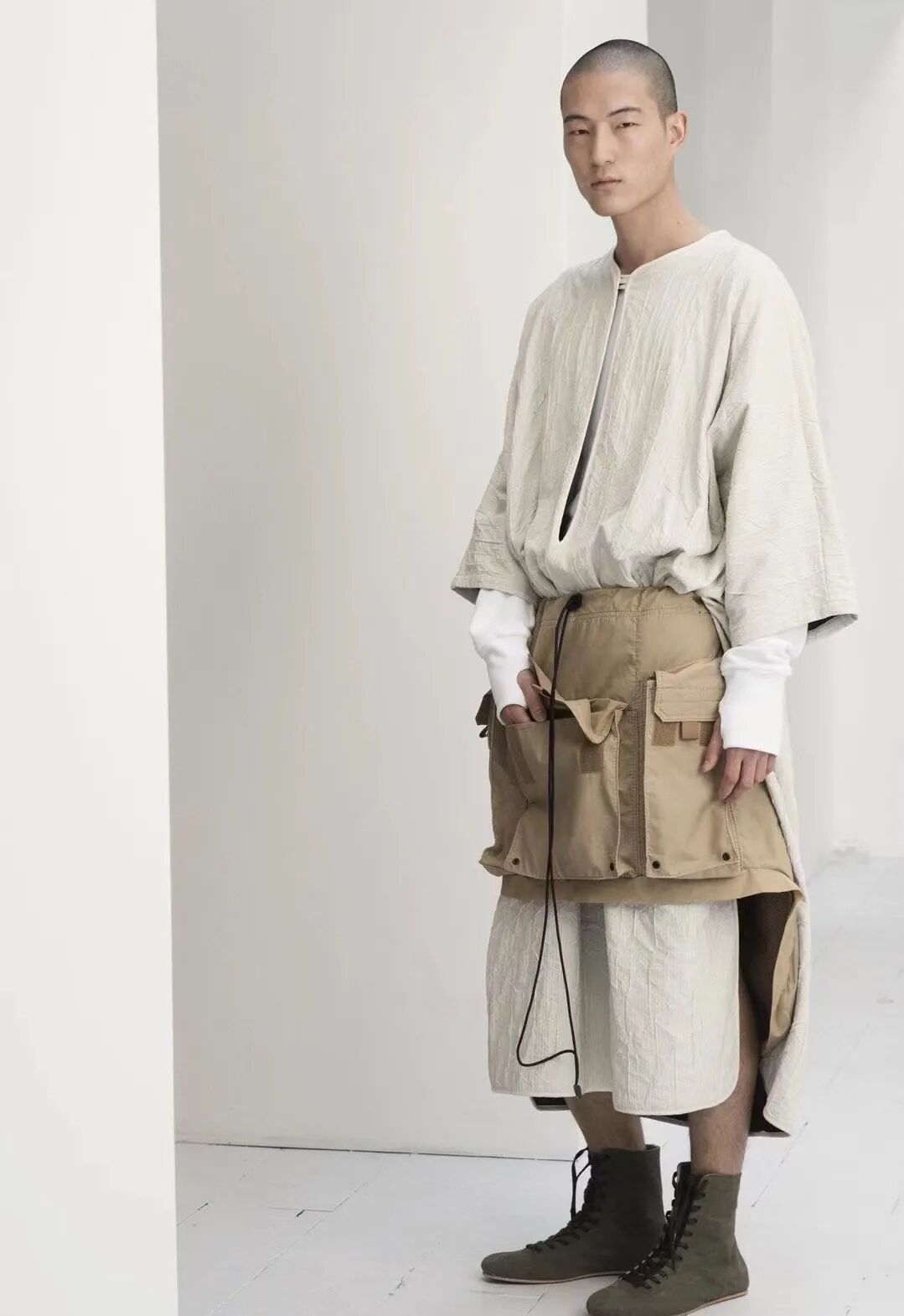 Hed Mayner的设计多以犹太剪裁为主,运动、军装、工装风格混搭,oversize加中性风格诠释的男装多了几分阳刚之气,模特的亚洲面孔搭配圆寸发型,让人第一时间想到少林寺,充满了街头主义和儒家文化的矛盾碰撞,暗含“积极入世”思想。