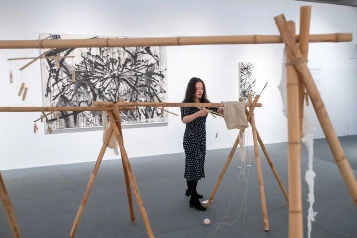 现场,沈沁站在她亲手布置的现代艺术装置“晒晒”前,动情地表达了她对家乡的深深眷恋。她说,记得儿时的苏州,随处可以见到几根竹竿搭建起来的日常晾晒景观。食品、衣物、棉被、书籍等生活必备品,经过阳光气流的蒸腾洗礼,清理可能滋生的霉变与腐败不堪,将此时此地的时空与能量“提纯”后,“收储”、“转化”到彼时彼地,晾晒衣物由此得以传续。时光流转,晾晒经验的逐渐形成,成为农业文化精耕细作、世代生衍的法门。平凡日常的阶段性晾晒行为,是文明仪式的集体经验,也是指向未来的斑斓叙事。