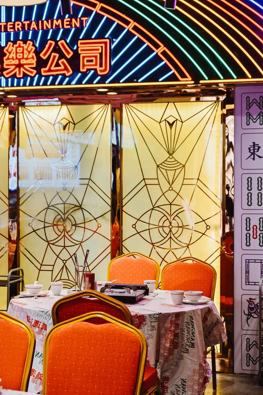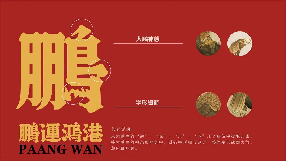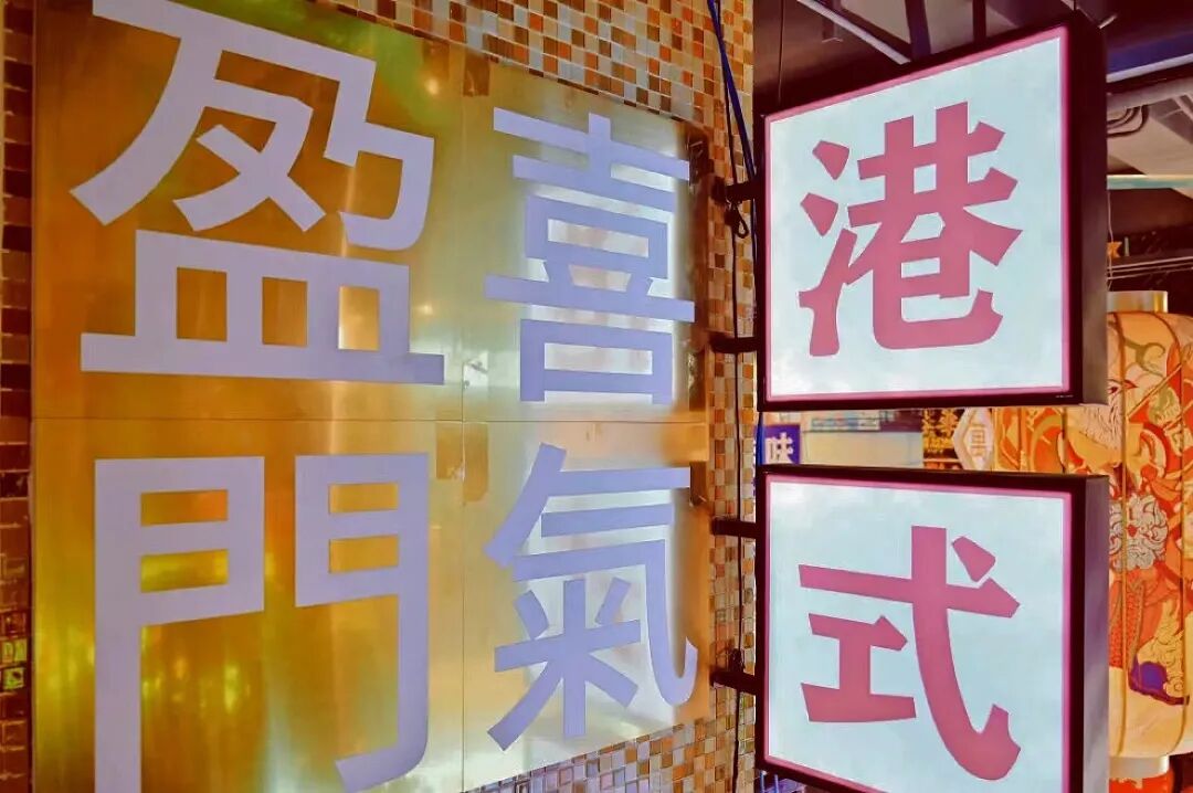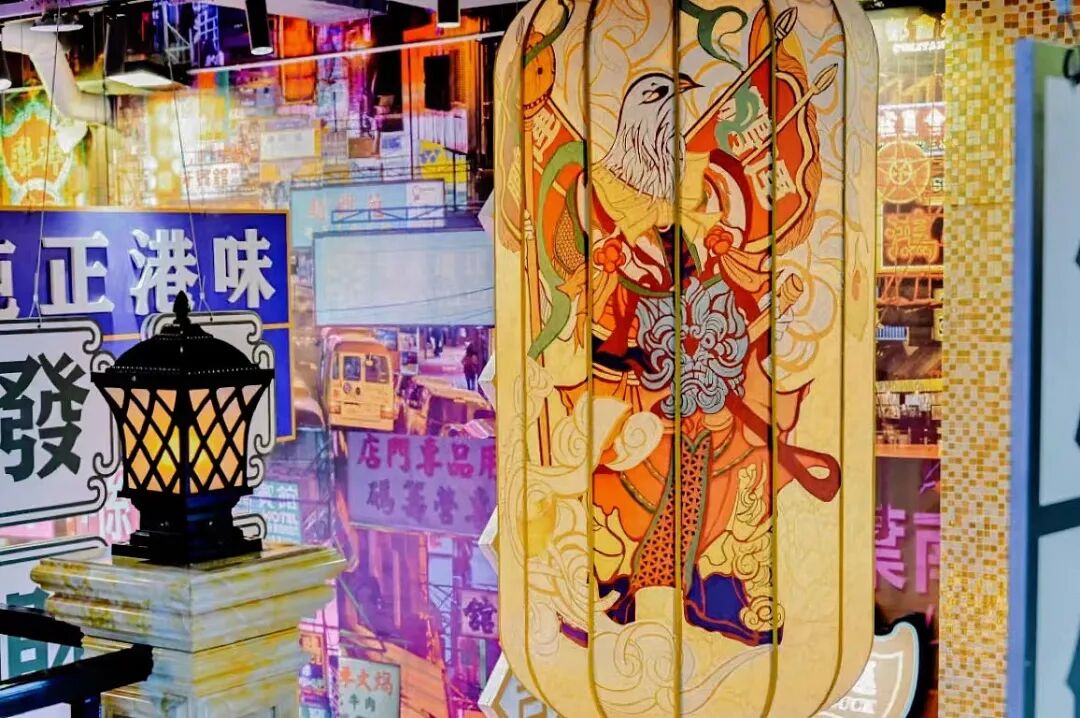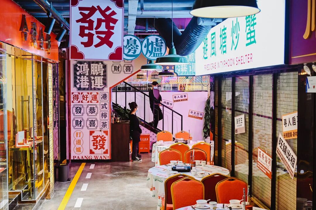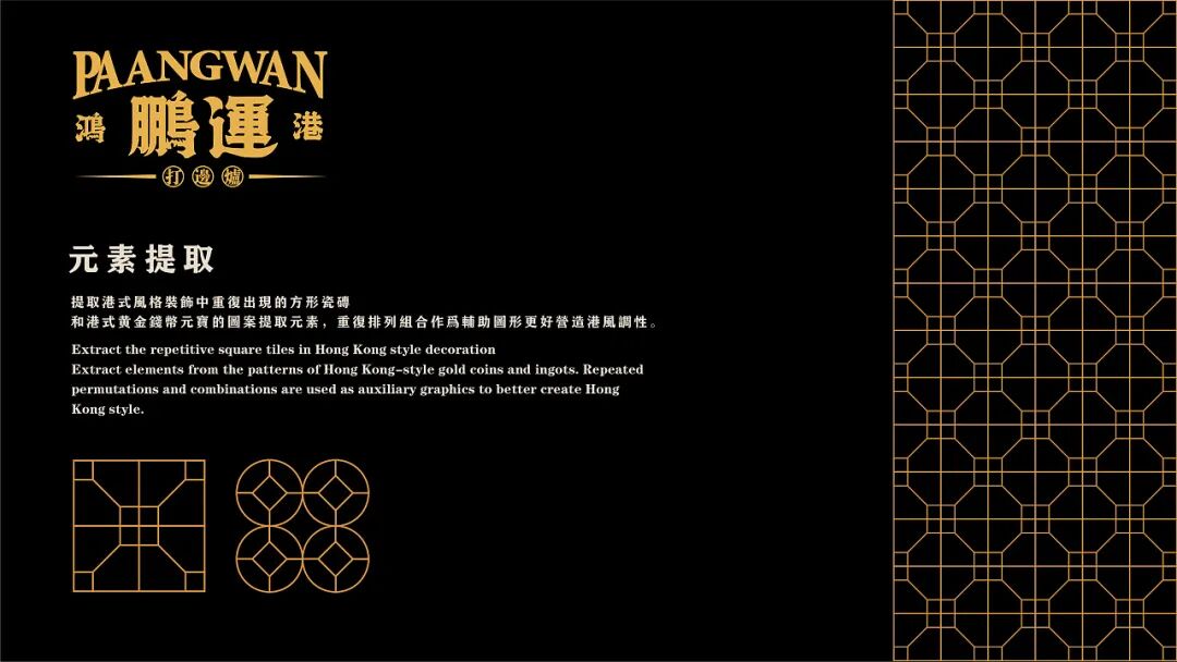 为了契合品牌调性、强化品牌形象,在LOGO设计上,以“大鹏一日同风起,扶摇直上九万里”的「大鹏鸟」为品牌形象进行创作,从大鹏鸟的“翅”、“喙”、“爪”、“羽”几个部位中提取元素, 将大鹏鸟的神态贯穿其中,进行字形细节设计,大气而磅礴。在其他空间延展中,以香港的老街景为出发,提取港式风格中重复出现的方形瓷砖,以及港式金钱币元宝的图案元素,搭配霓虹灯、大字报、马赛克等装饰,用流行设计手段+经典元素的组合手法,在还原香港老街人文风情的同时,带来更多全新的体验。
