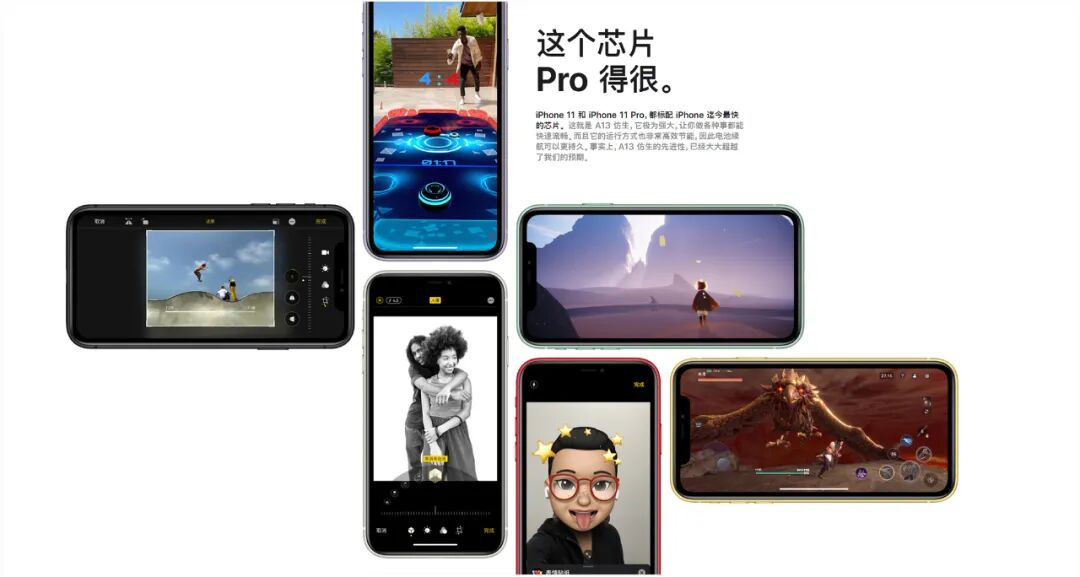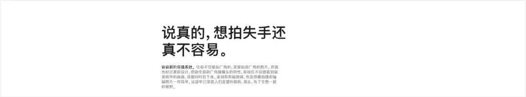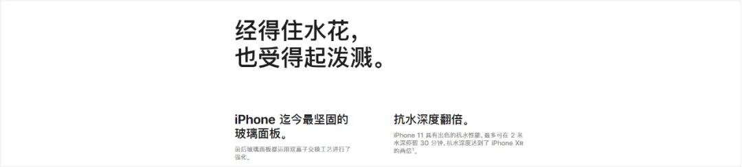 以iPhone11官网展示为例,第一张图加一行“一见倾心,现有六次机会”基本就告诉了他的产品配色的丰富性(核心理念表达),因为在这之前苹果这个系列没有这么丰富的色彩配置,所以用一张配图加以说明。