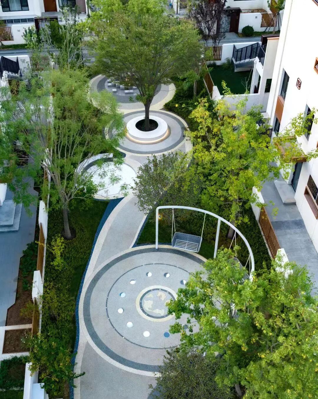 不规则曲线道路也是居住区景观中的常用设计手法,曲线构成更符合人行走的规律,方案细节也更值得仔细推敲。曲线形式的道路铺装更能够体现景观的自由感与现代感,同时对施工工艺的要求也更高。在铺设过程中,曲线构成需要更多地考虑如何美观排版,以及关键部位对异形砖的使用。