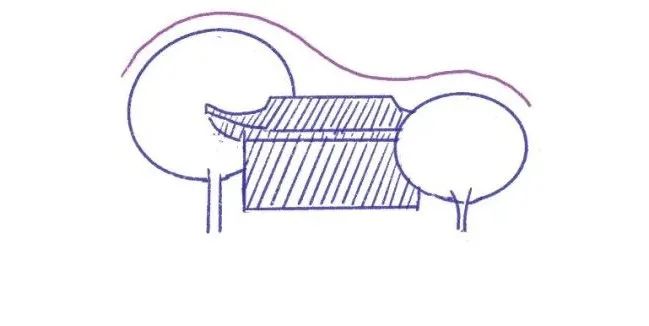 挑高的骨架乔木一定是在亭廊的一侧做背景,另一侧的前景配植一棵姿态优美的中乔或小乔(示意图如下),形成亭廊与植物的搭接掩映。