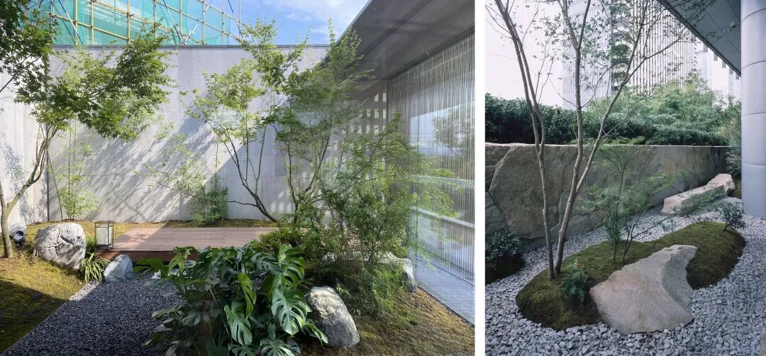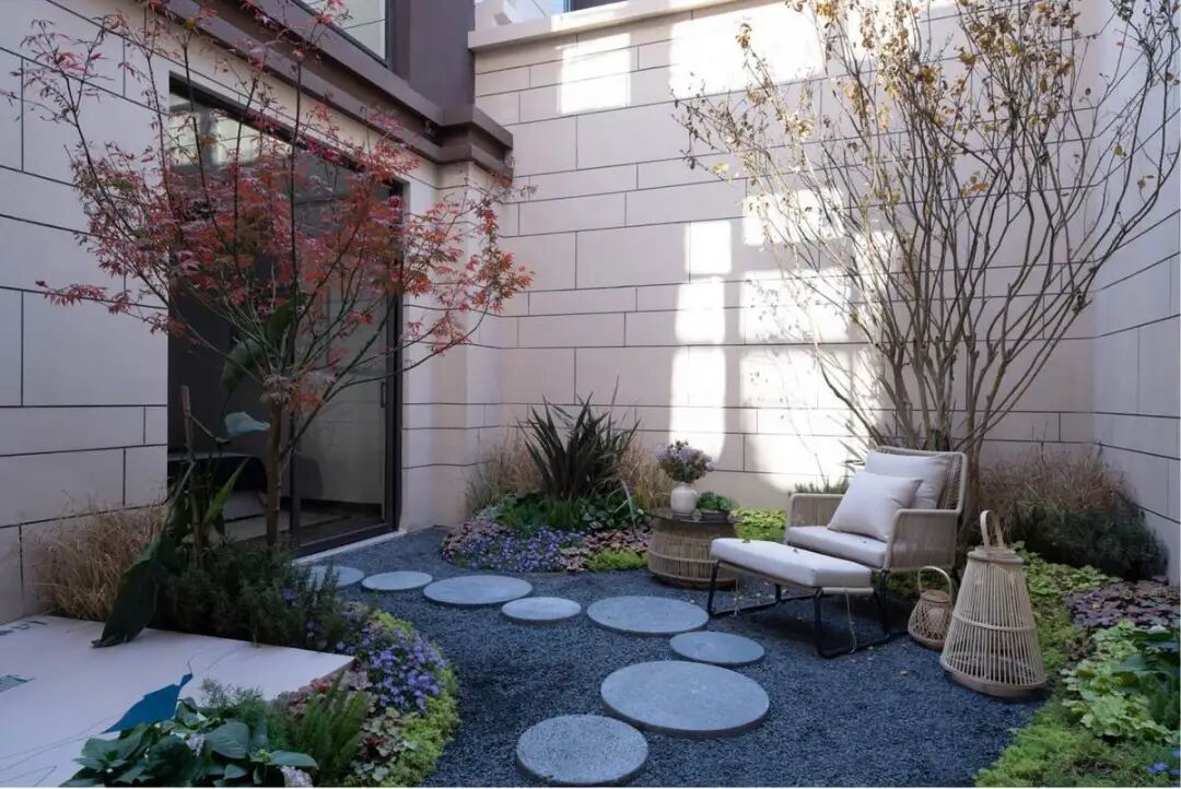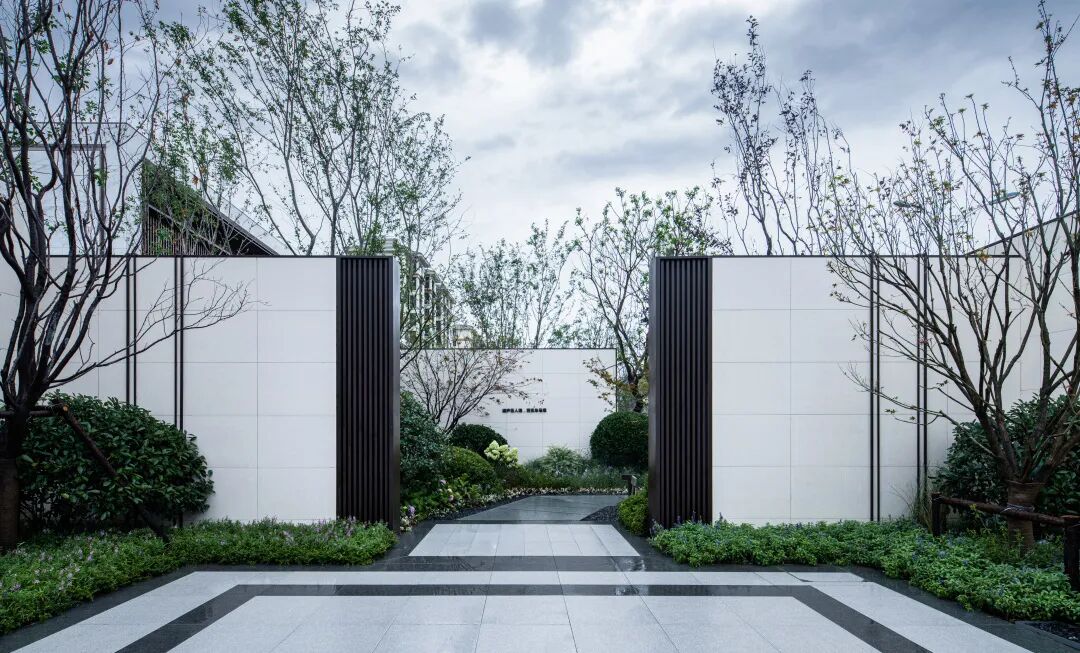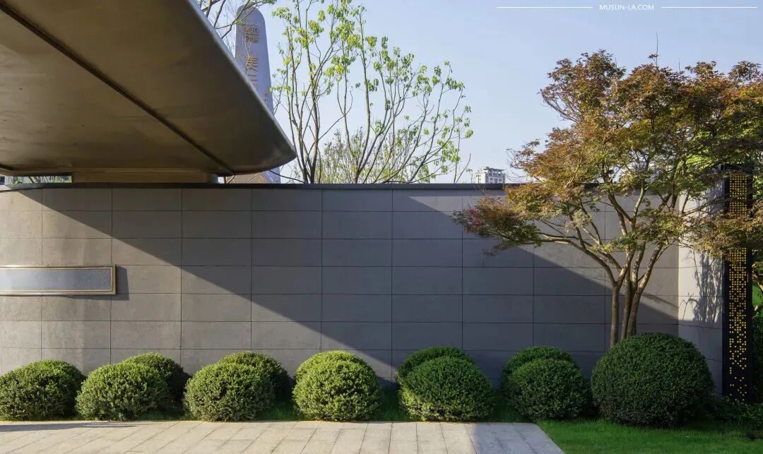 与景墙结合,多以孤植为主,下层与花境、景石、球、修剪篱或砾石搭配,景墙做背景。