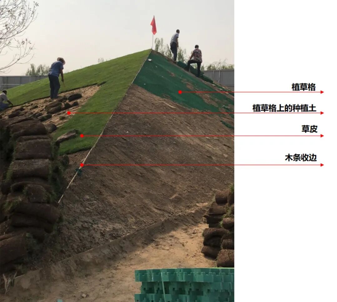 已堆砌好且夯实的地形之上,用植草格固定斜面,用木条/钢条勒出棱角,在植草格之上再铺一层种植土