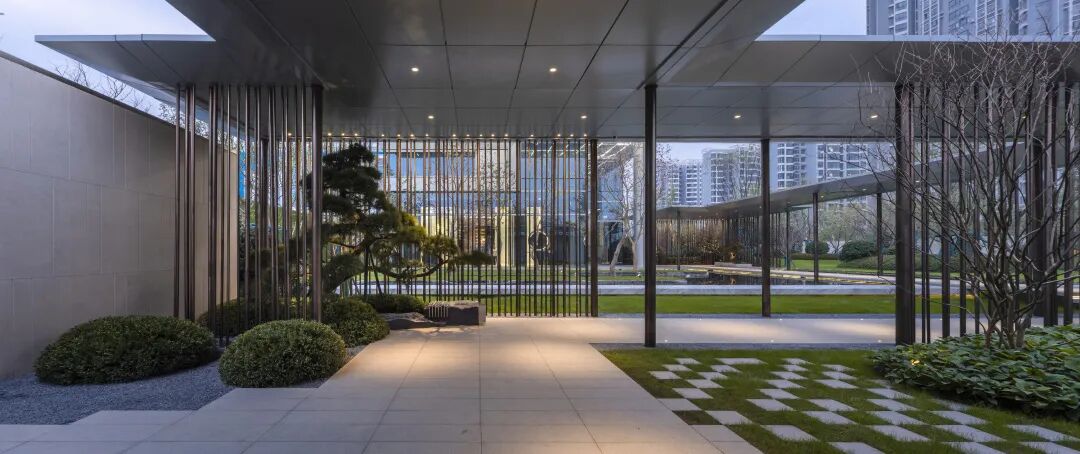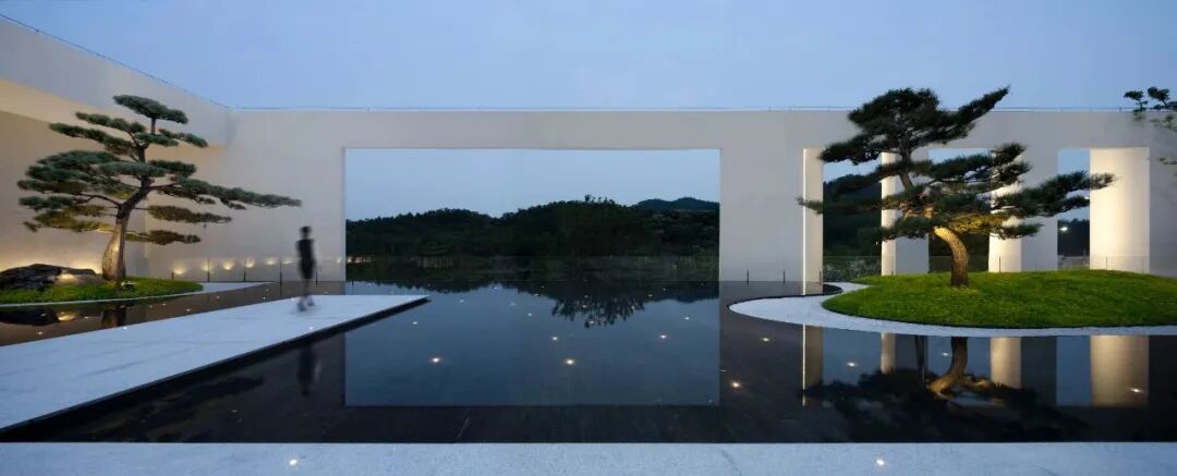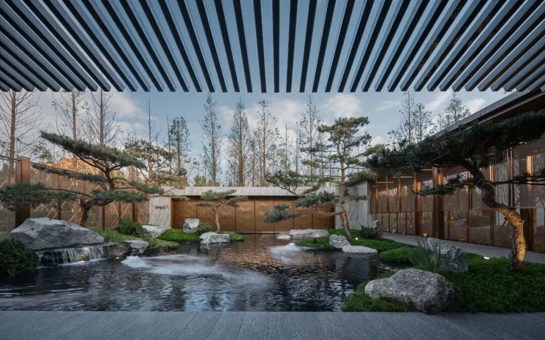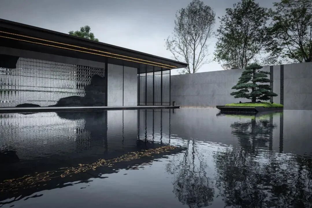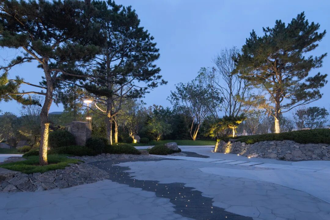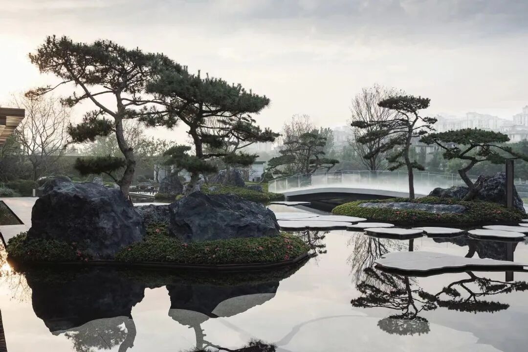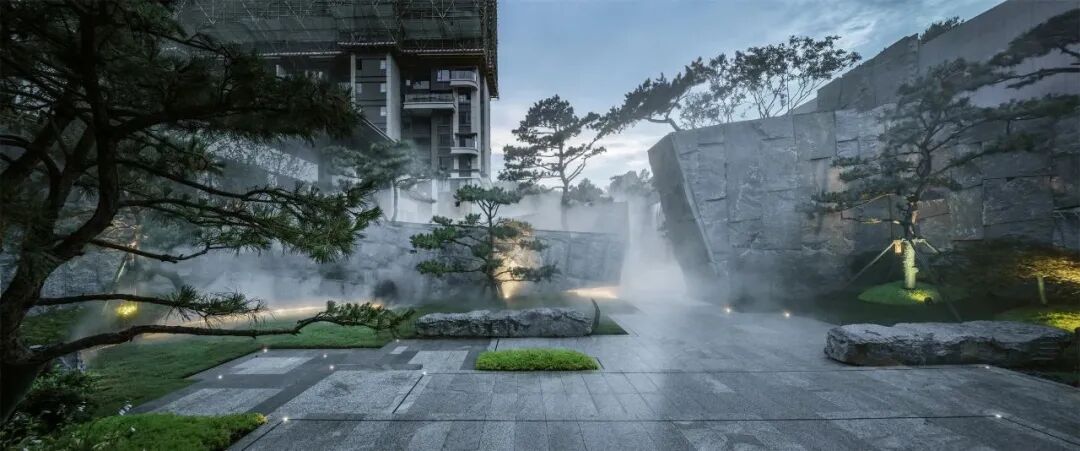 ——与水与石结合,宛如游龙般,灵动,下层地被以纯粹的绿色基调为主,或草坪或修剪绿篱,营造沉稳、低调的场地氛围。