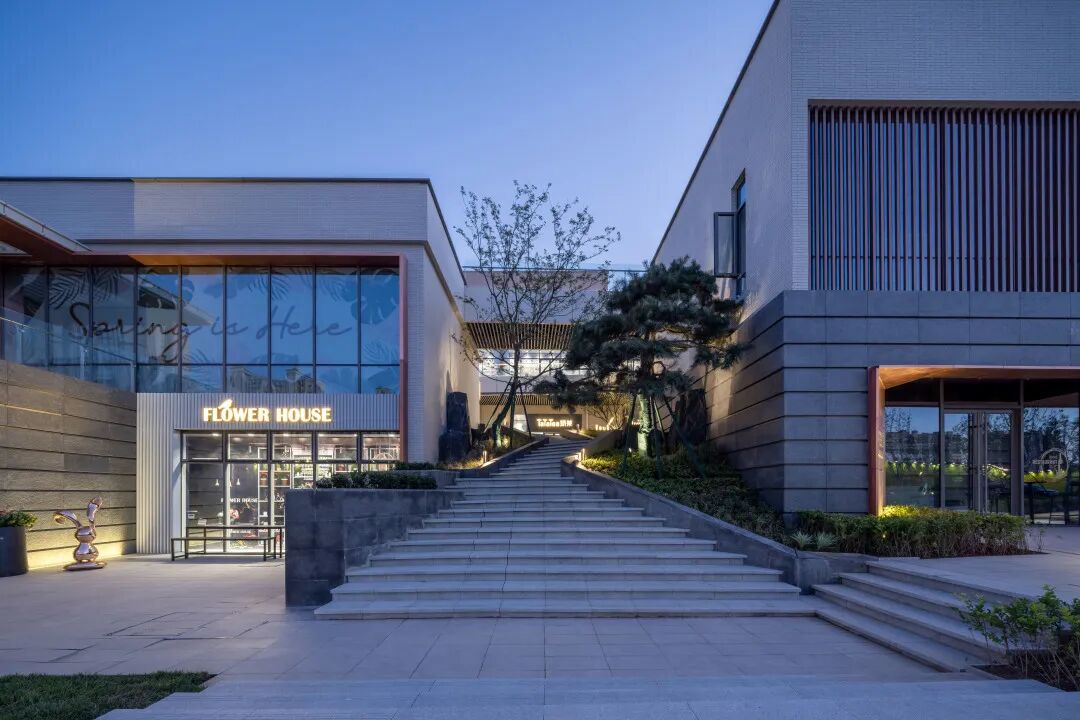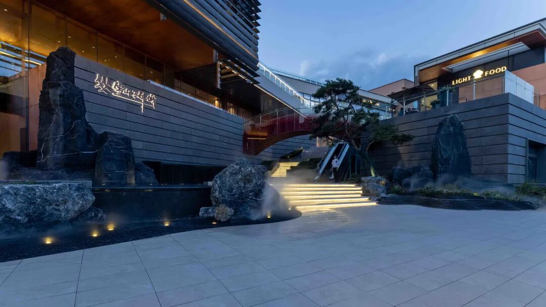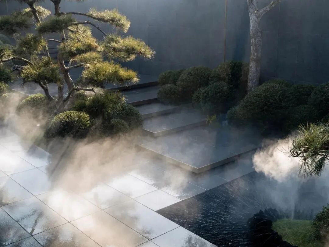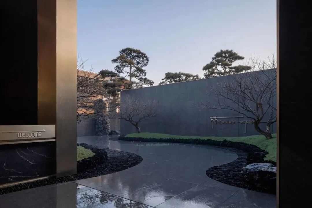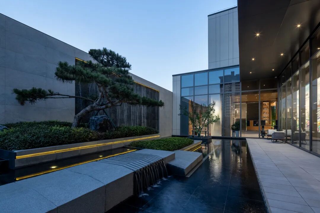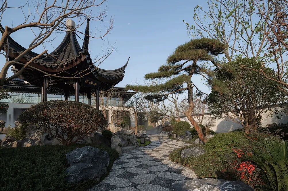——与水与石结合,宛如游龙般,灵动,下层地被以纯粹的绿色基调为主,或草坪或修剪绿篱,营造沉稳、低调的场地氛围。