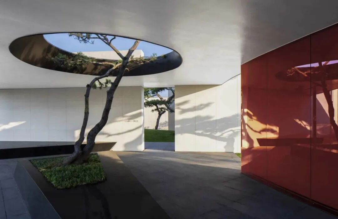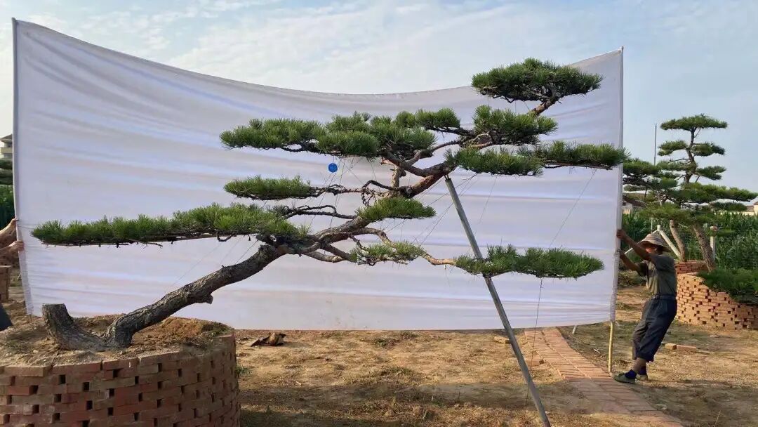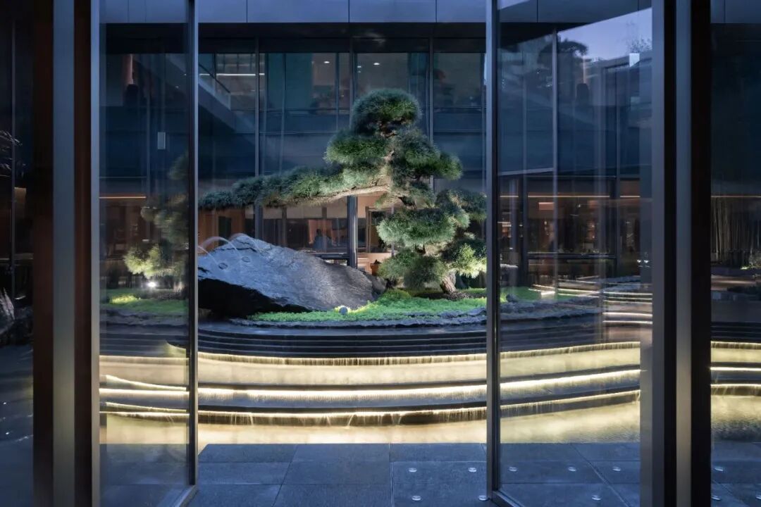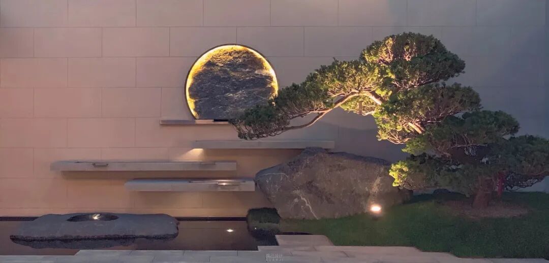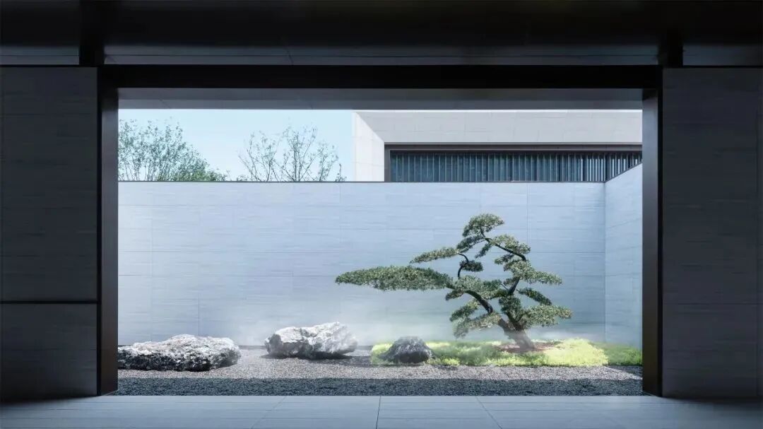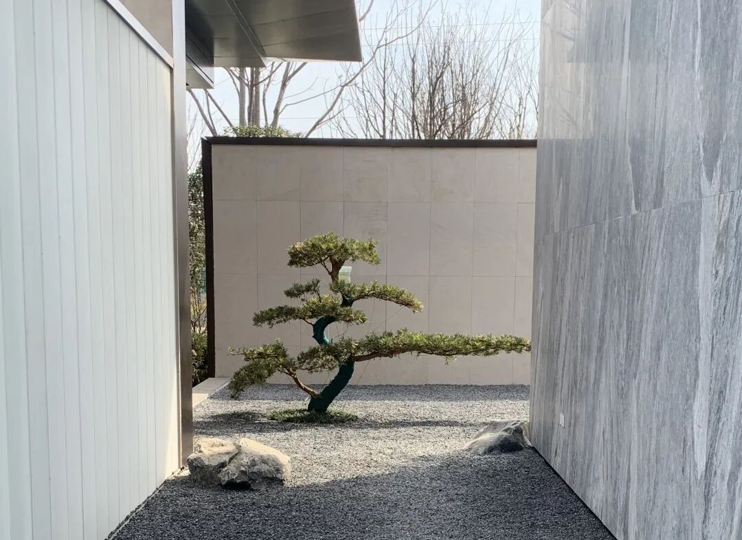 硬质围裹的空间中单独成景,松的形态可斜飘,可周正
